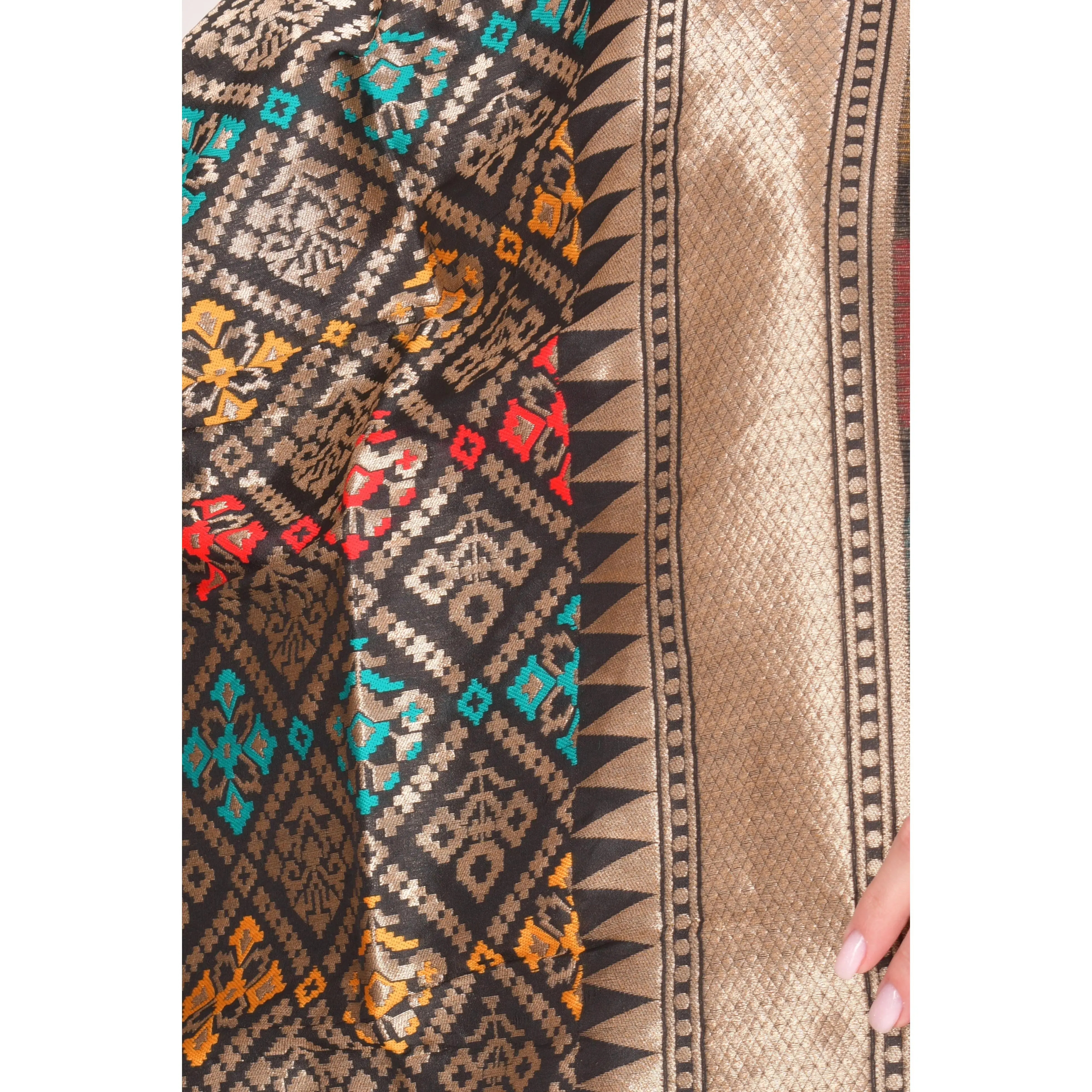 Effortlessly sophisticated, this black jacquard dupatta is crafted in smooth polyester with a rich woven texture that catches the light with every movement. The all-over jacquard pattern creates a luxurious, dimensional surface that pairs beautifully with festive ethnic outfits. Finished with decorative tassels at each end, this dupatta brings a traditional finishing touch to any lehenga, suit, or saree ensemble. Ideal for sangeet celebrations, wedding receptions, and evening partywear.