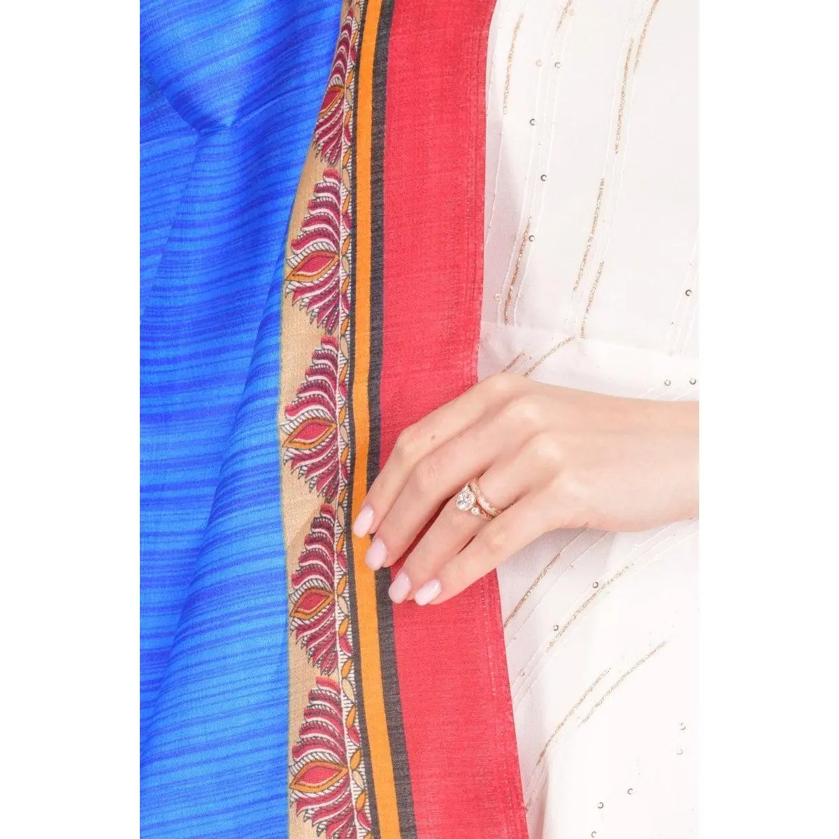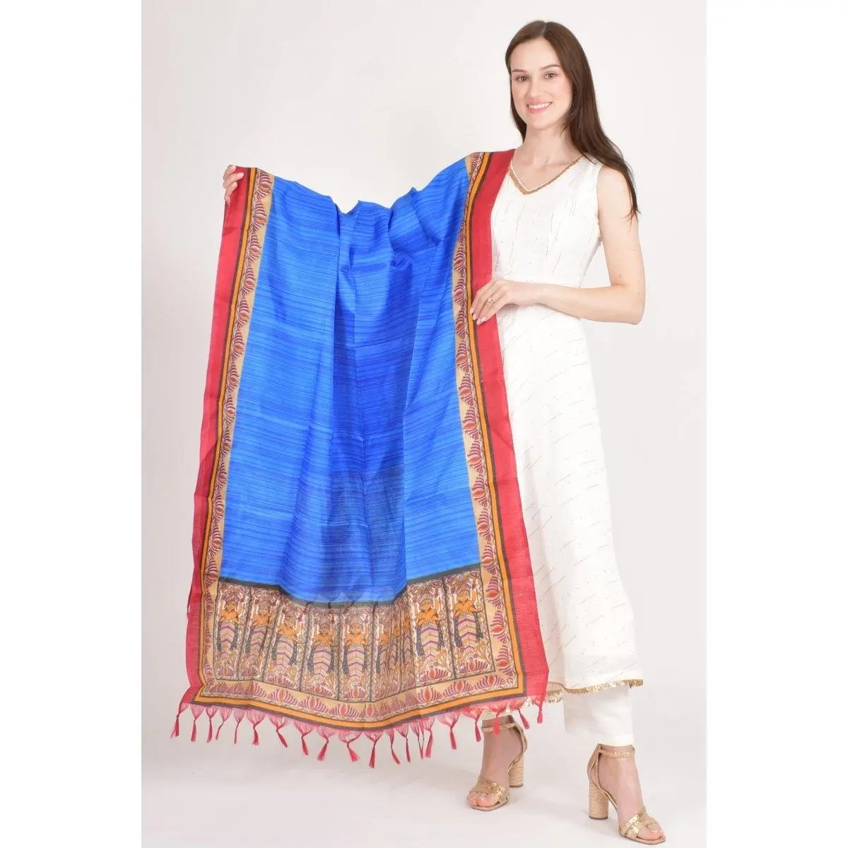 This vibrant blue polyester dupatta stands out with its artfully printed border accents that frame the fabric in rich pattern and color, creating a striking, festive accessory for any ethnic wardrobe. The lightweight polyester fabric ensures a fluid, graceful drape whether worn across the shoulders, over a lehenga, or styled as a stole. Playful tassels at each end add a traditional handcrafted finish that feels both celebratory and refined. Pair it with a lehenga choli, anarkali, or salwar suit for sangeet nights, cocktail parties, and wedding festivities.