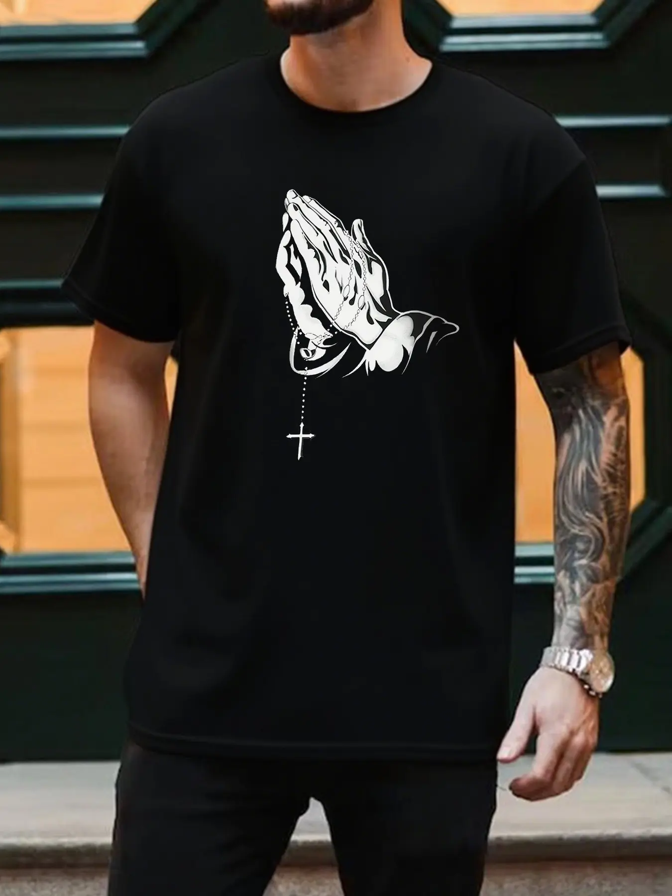 American High Street Prayer Hand Cross Print Short Sleeve T-Shirt, Men's Summer Fashion Loose Casual Top, Trendy and Comfortable