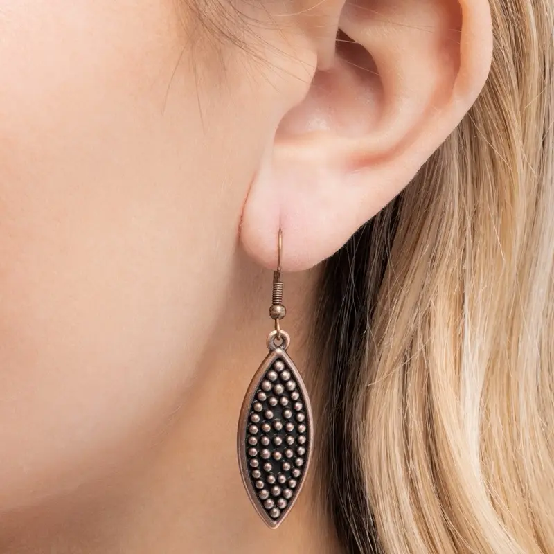 An antiqued copper chain features a collection of texture marquise shaped frames . each detailed with dotted patterns and vibrant turquoise accents .The symmetrical arrangement of there elements creates a statement design. Combining bold metalwork with vivid color . Features an adjustable clasp closure. As the stone elements in this piece are natural, some color variations is normal.
