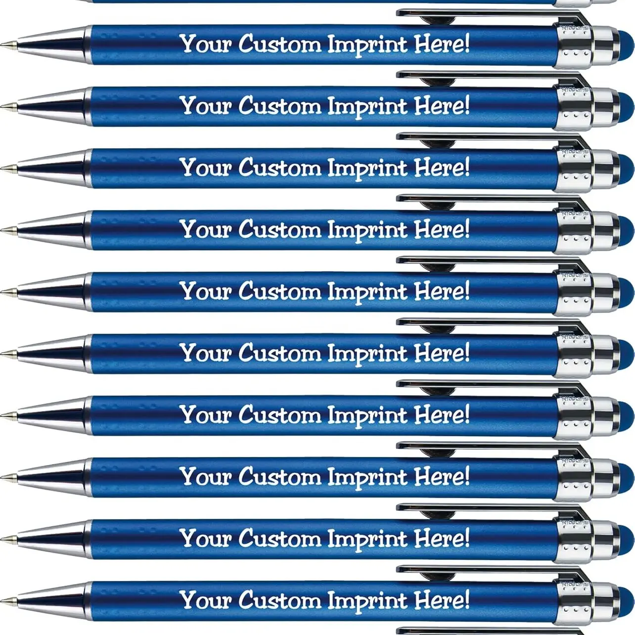 12 Colorful Stylus Pens in a box. Chic and trendy, these pens make a quality impression. Rich matte finish, satin chrome accents, and color-matched stylus. Imprint in the color shown. Personalization: 40 characters per line, 2 lines included. Slide the clip to use or retract. Ultra-smooth writing cartridge. Metallic barrel, satin finish, medium point. Click-action retractable. Durable plastic construction. Smooth, smear-free RiteFlow ink.