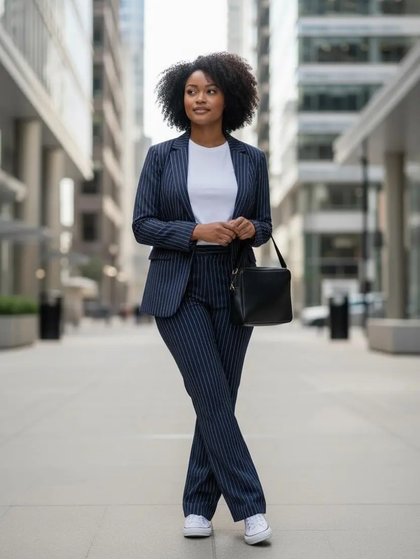 ·Full Ensemble: Includes both the structured blazer and coordinated pinstripe trousers.