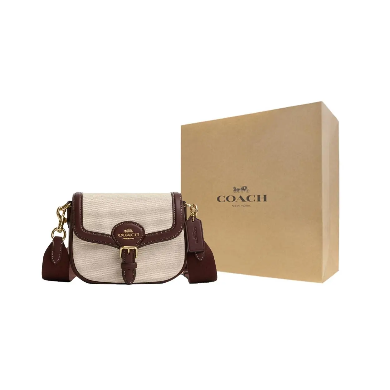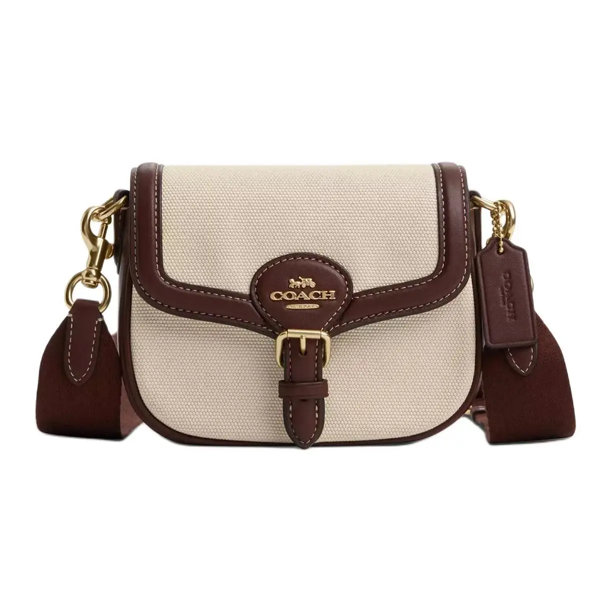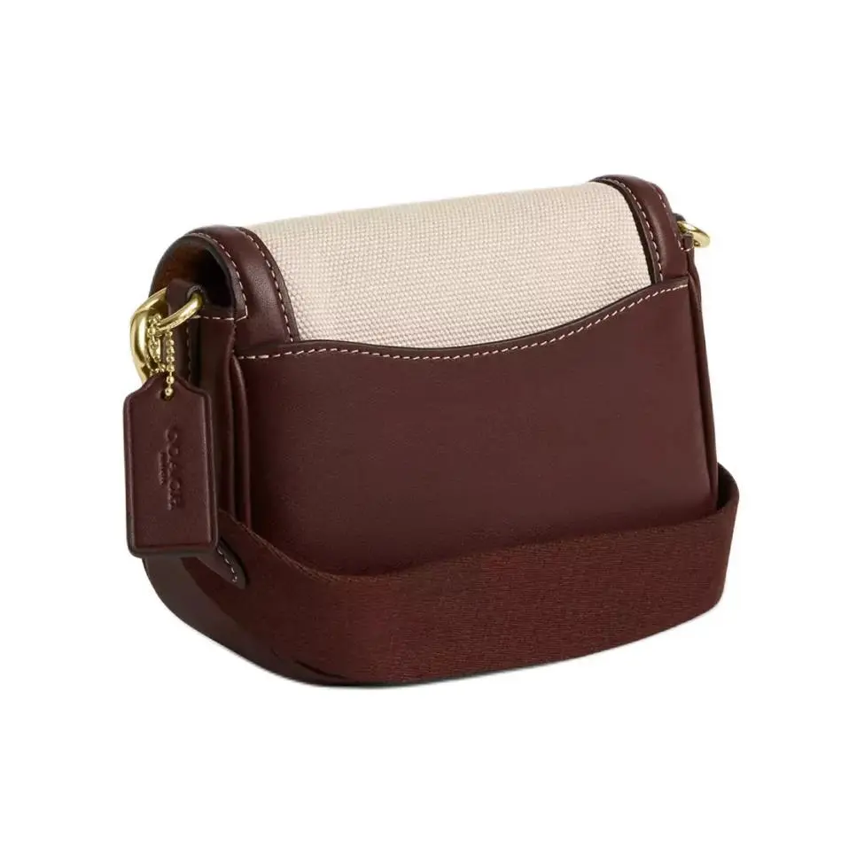Materials: Exterior: Water-resistant coated canvas (main body) + premium natural-finish smooth leather (flaps, trim, strap). Lining: Soft, durable cotton twill with COACH branding. Hardware: Polished gold-tone metal with anti-tarnish coating.