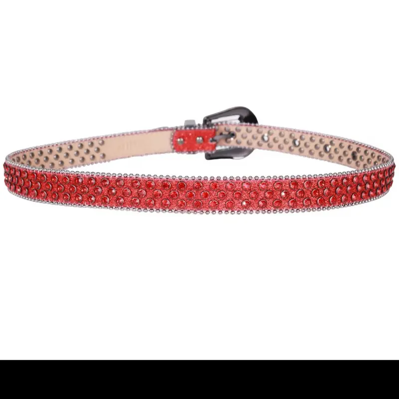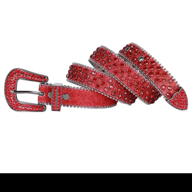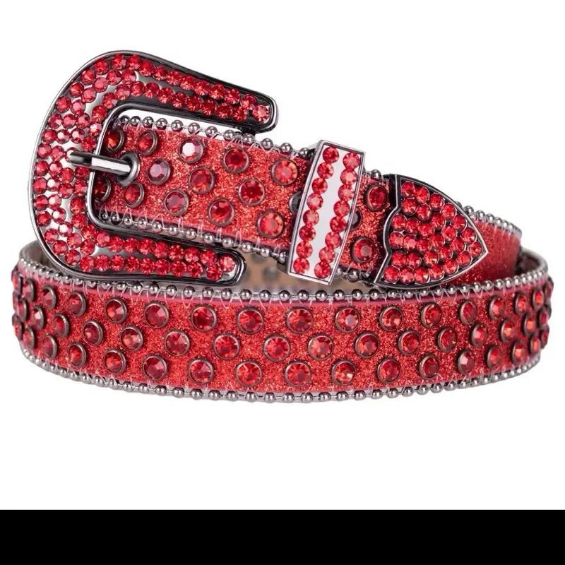 ✨ This belt features a dazzling red rhinestone buckle that catches the eye. The sparkling design adds a touch of glamour to any outfit. Perfect for those who love to stand out. The belt is a statement piece that enhances your look effortlessly.