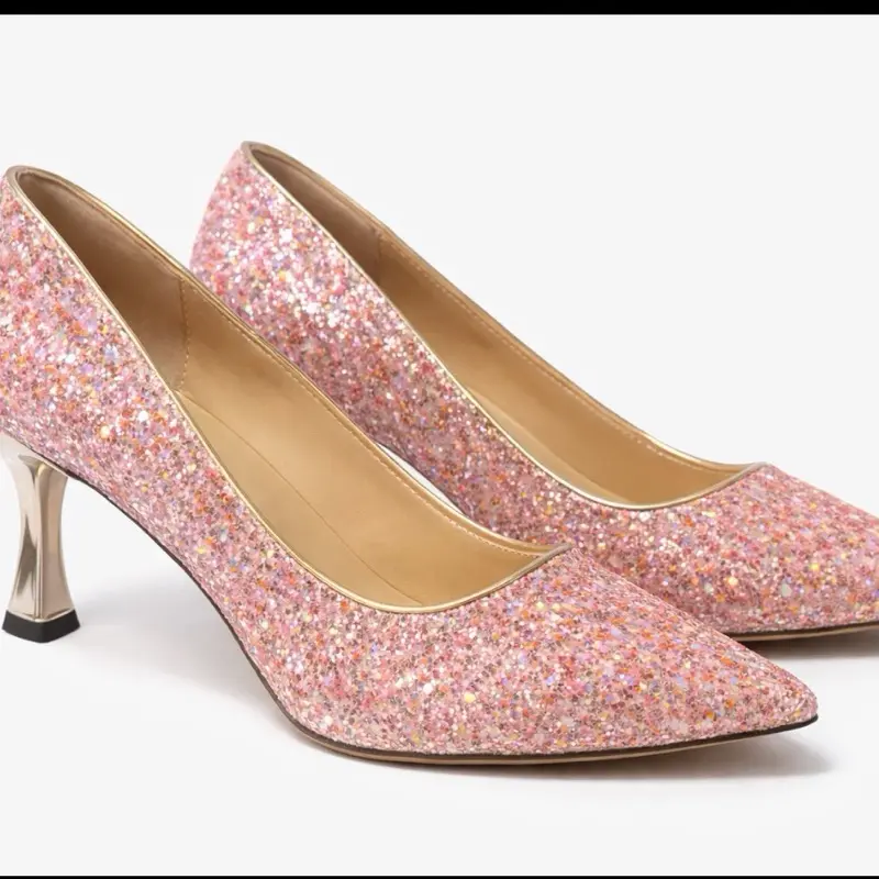These heels are versatile, suitable for various party settings. The pink glitter color complements many outfits. Step into the spotlight with these elegant heels. They are a must-have for your party wardrobe.