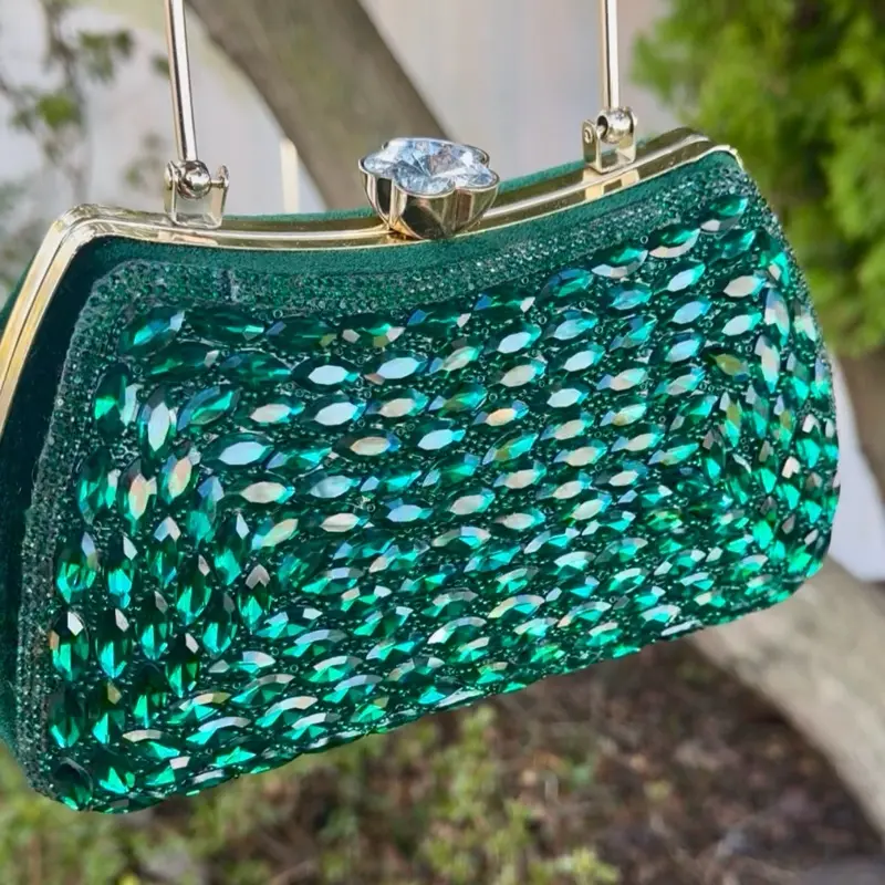 Beautiful clutch for your special day use, comes glittering with a velvet base and adorned with emerald crystals. Come see the detachable sling fit a Phone.