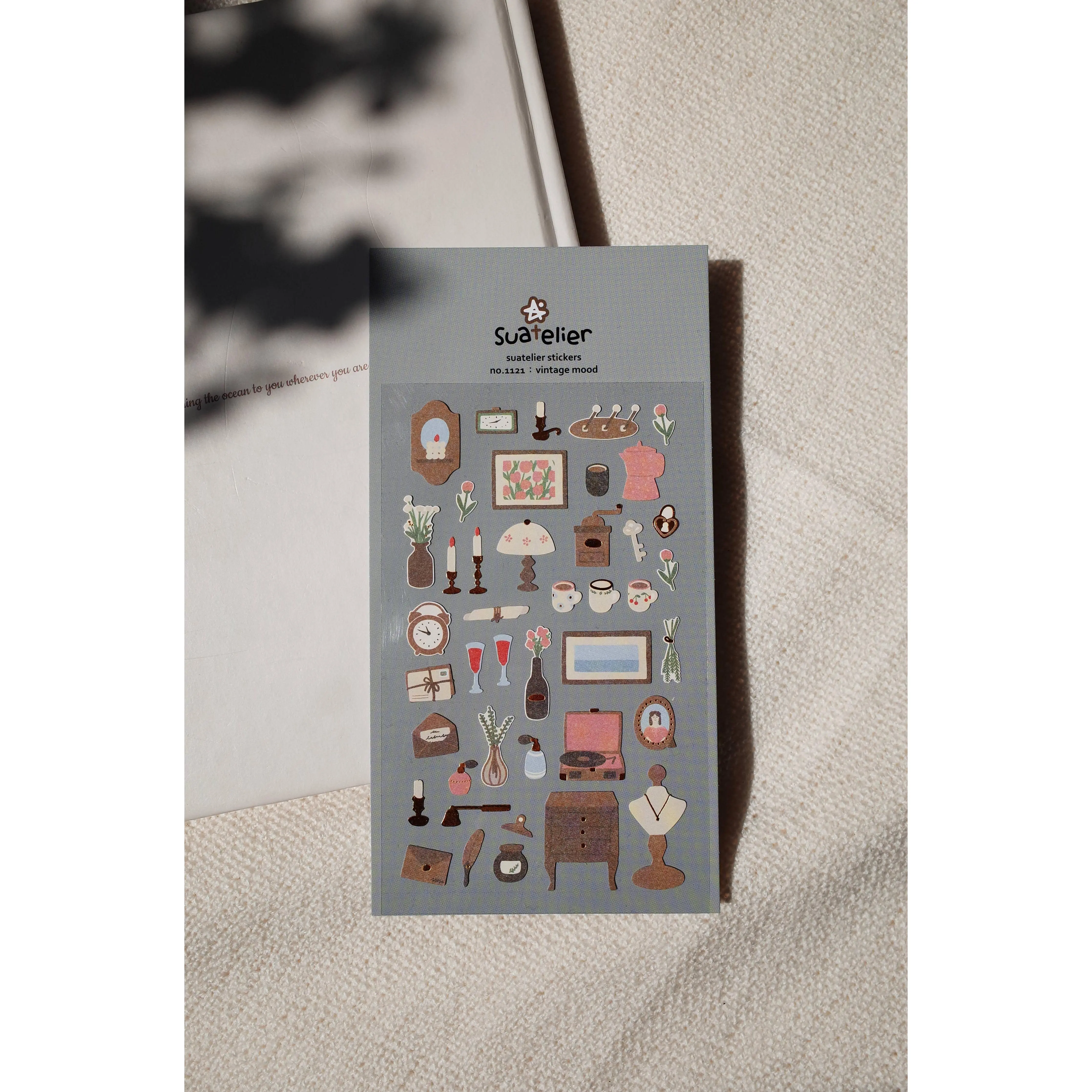 Vintage Mood is for anyone who loves the look of old-world charm. This sheet is filled with beautiful antique items: a wall clock, candlesticks, a table lamp, a coffee grinder, teacups, a record player, a vintage dresser, even a jewelry mannequin and perfume bottles. The dusty blue-grey background gives the whole sheet a moody, collected feel that stands out from most sticker designs. If your planner style leans toward classic or cottagecore, this one belongs in your collection. It's part of Suatelier's main sticker line.