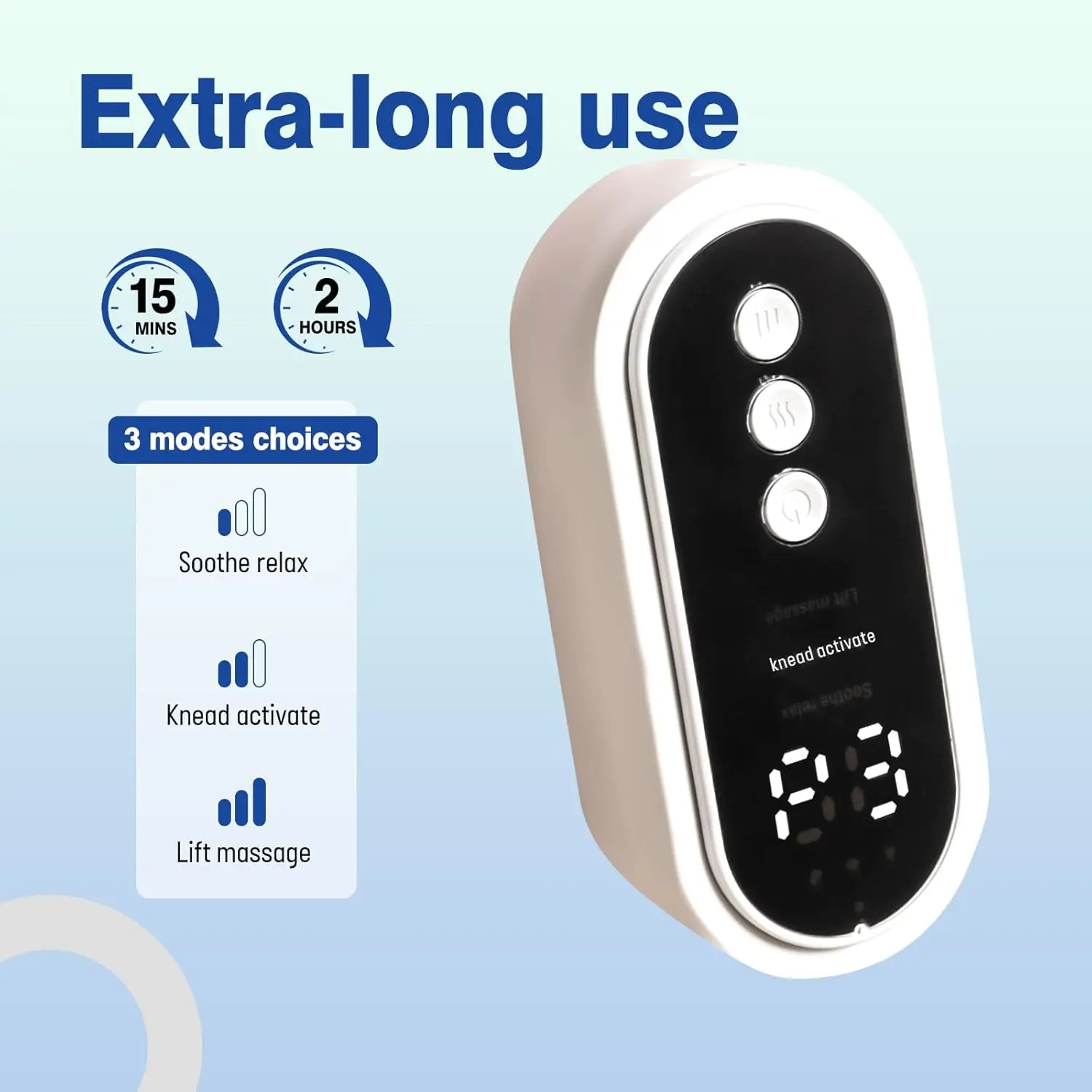 Charge using the Type-c data cable, select one of the 3 modes using the one-click control, place the massager on the target area, and use for up to 15 minutes. The massager simulates kneading and stroking techniques for an effective massage. Always follow safety precautions and do not use for more than 15 minutes at a time.