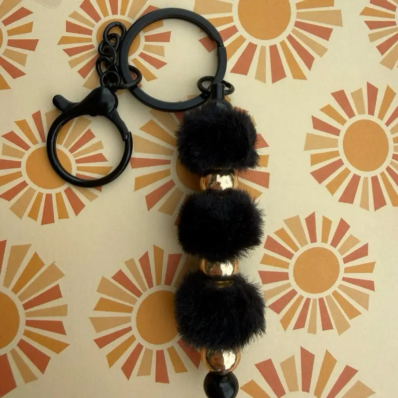 ·Design Highlights: This keychain features a sleek black design, adorned with faux fur pom poms and gold accents. Perfect for adding a touch of elegance to your keys. 🌟