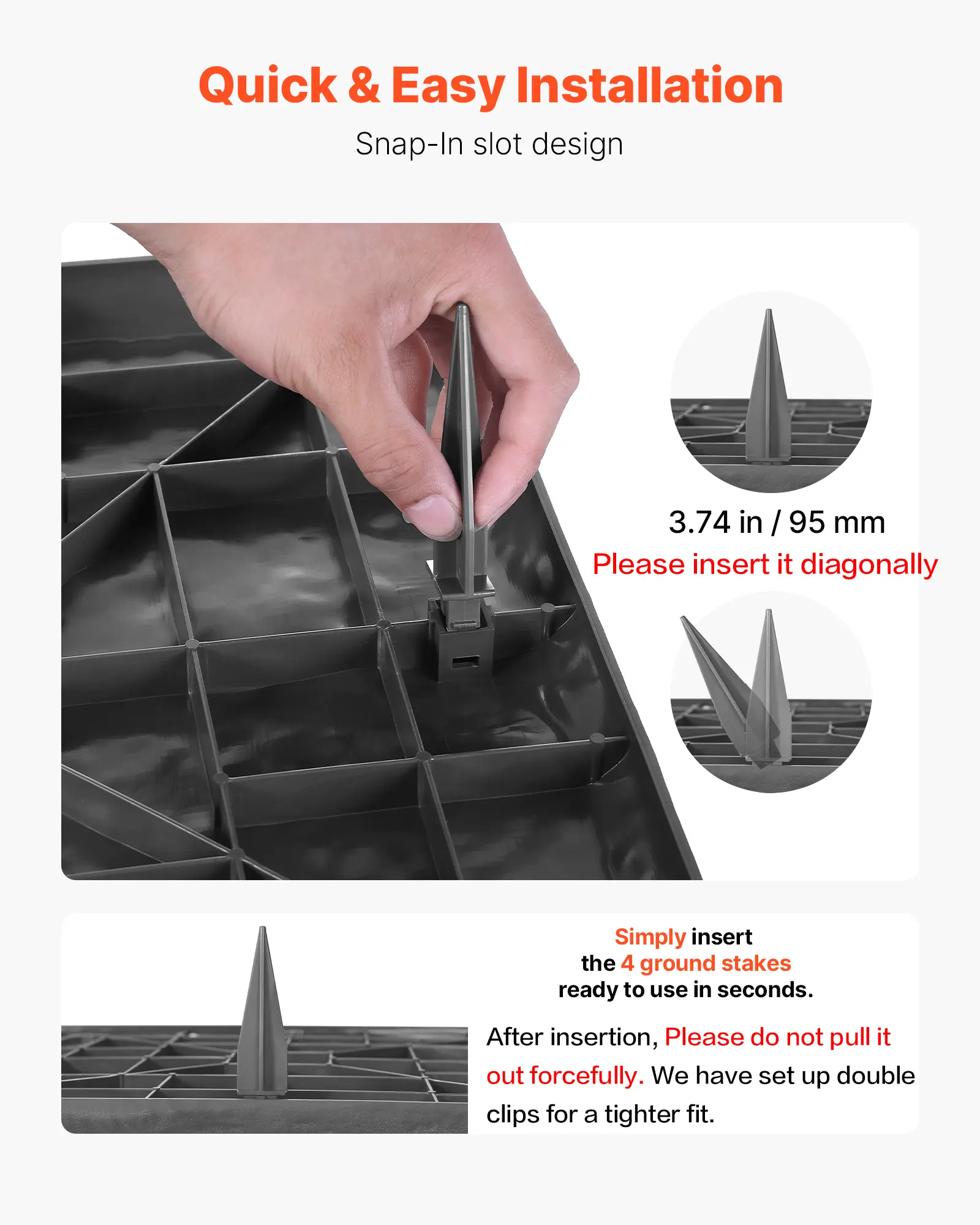 Tips: Create a horizontal surface and remove all rocks and debris from the ground. If the ground beneath the stone is uneven, the stepping stone will not be placed correctly on the ground and will not be solid. Please insert the ground nail diagonally. The ground nail is equipped with a snap and will be very secure after insertion. Please do not pull it out forcefully.