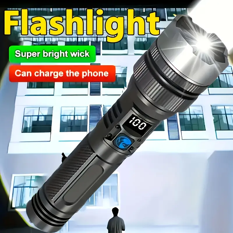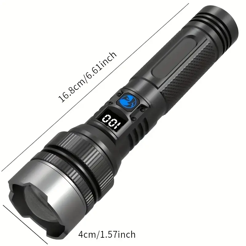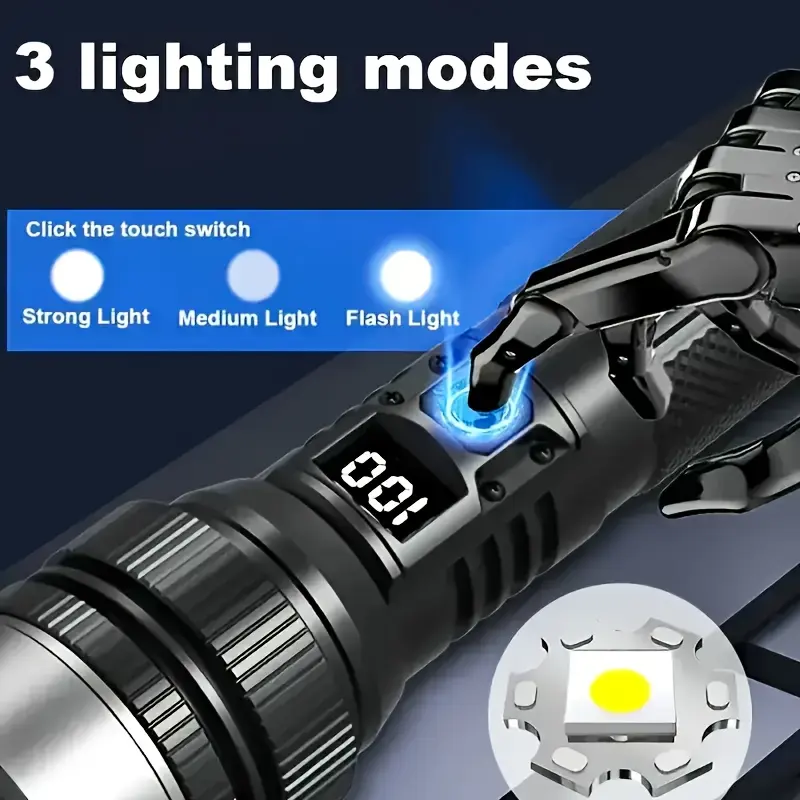 Illuminate your adventures with this multi-functional LED flashlight. Perfect for camping, fishing, and hunting, it offers a digital display and adjustable zoom. Stay prepared with its Type-C charging capability. This durable light is IP65 rated, ensuring reliability in various conditions.