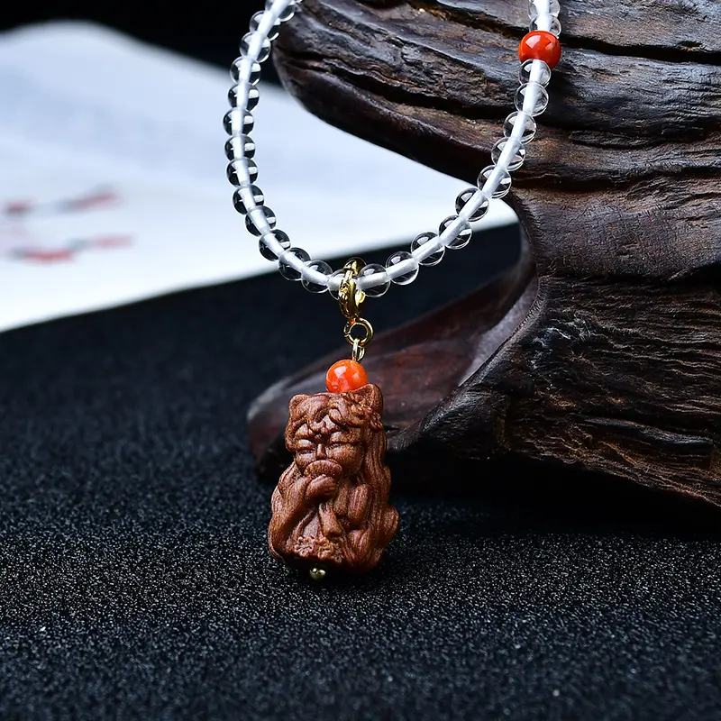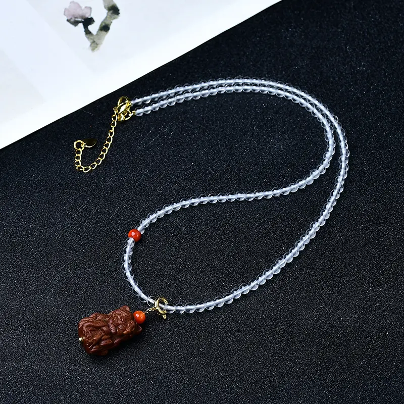 This exquisite handcrafted necklace features premium faceted clear quartz beads, paired with a hand-carved sandalwood fox spirit pendant, accented with natural red agate and gold-plated accessories.