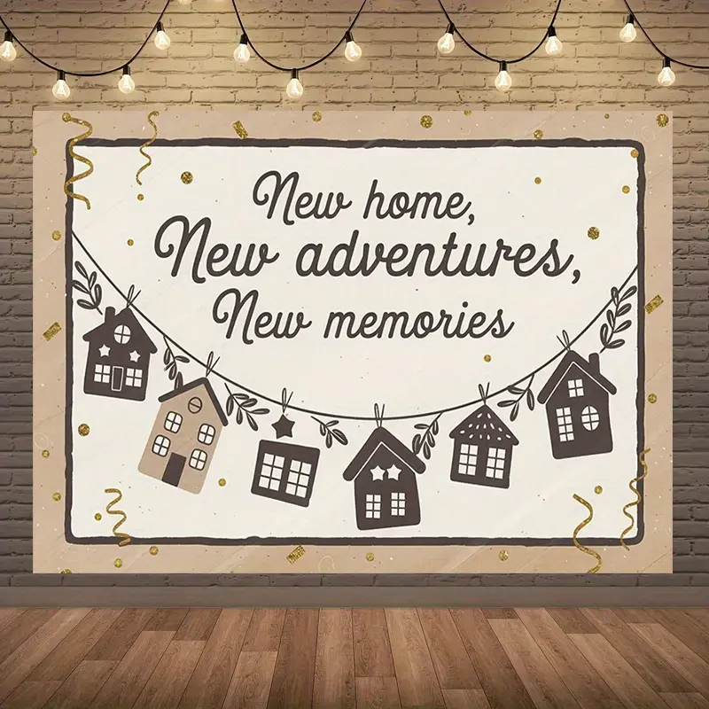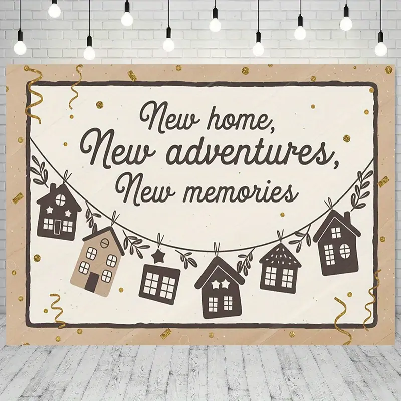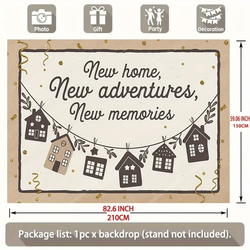 1pc Housewarming Party Banner - "New Home, New Adventures, New Memories" Backdrop Decor with Golden Glitter & Cartoon Houses Design, | Rustic Banner | Polyester Banner, House Decorations for Home