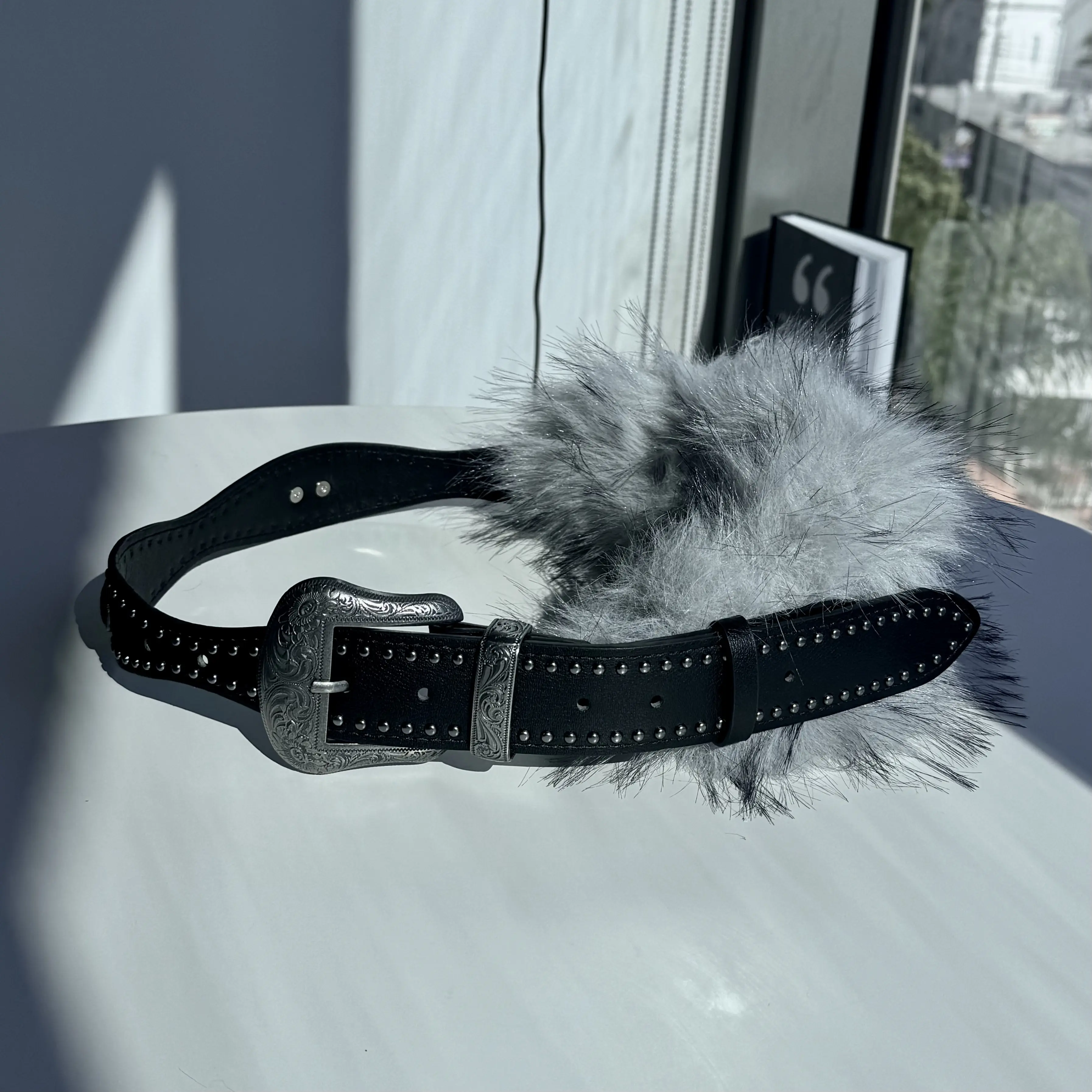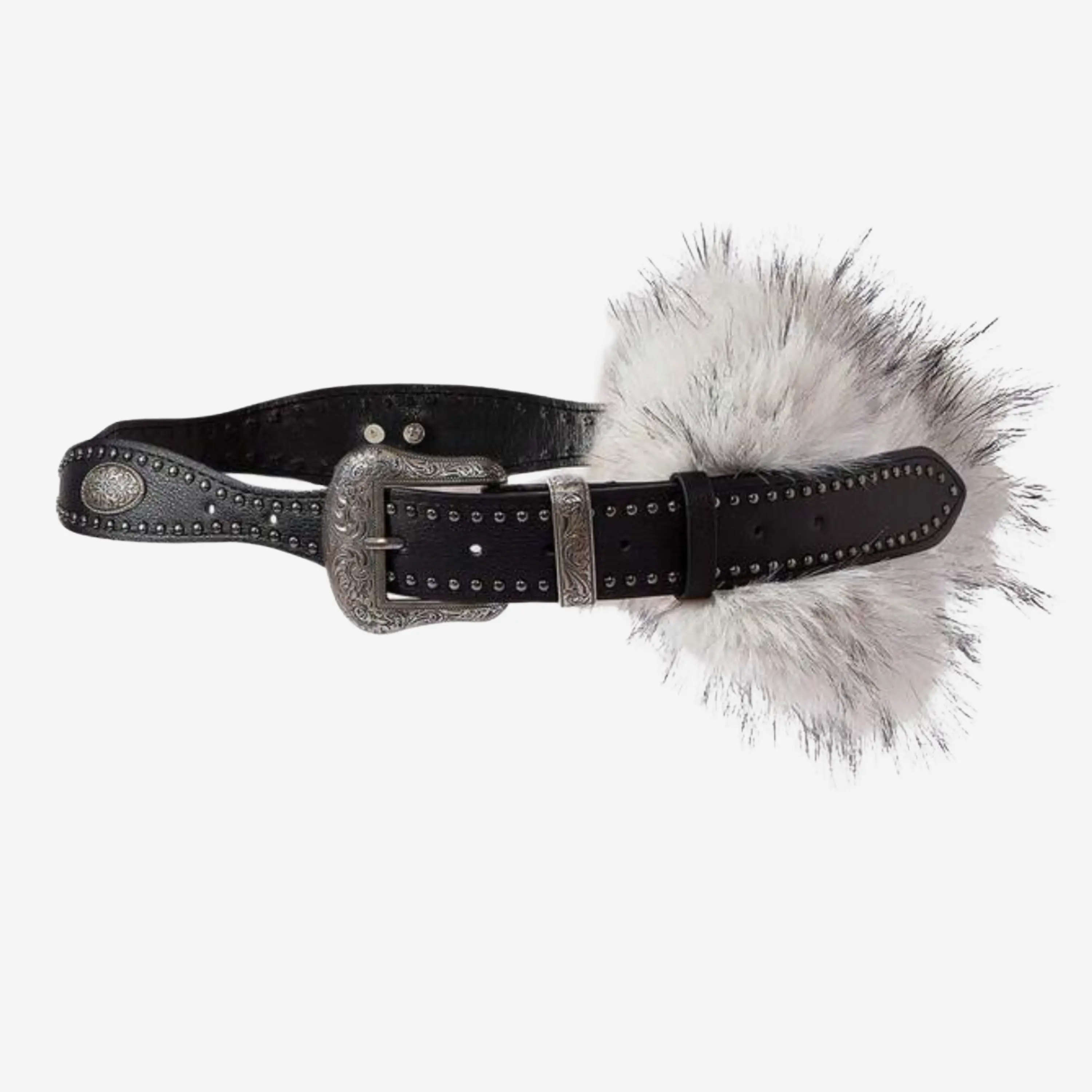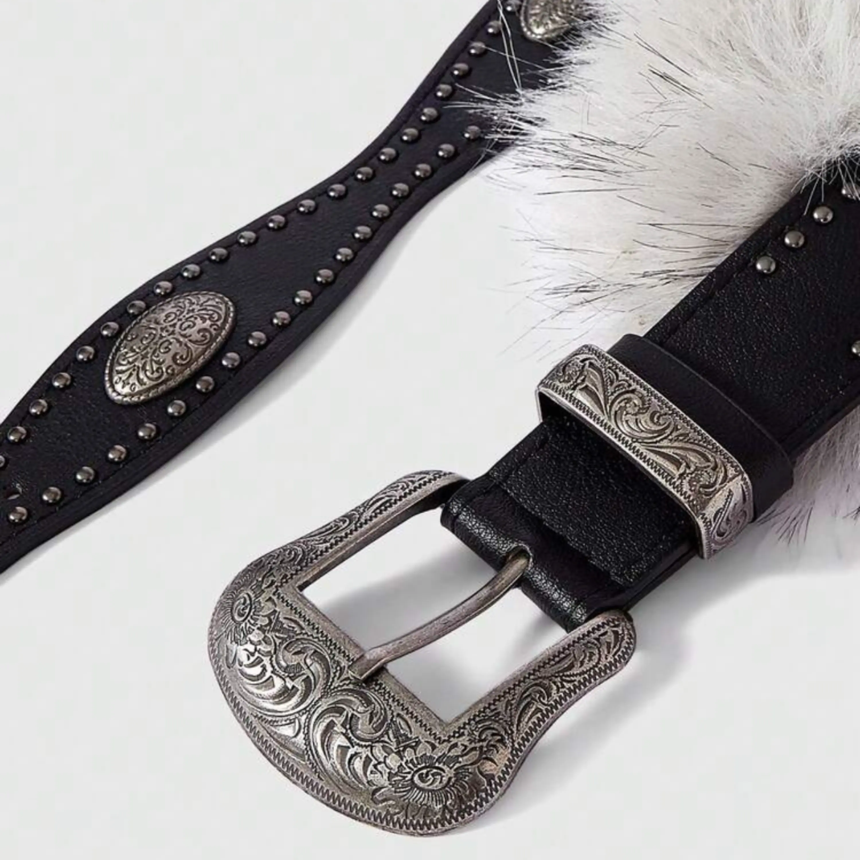 Black Studded Belt with Faux Fur Pompom – Y2K Punk Western Statement Accessory for Women