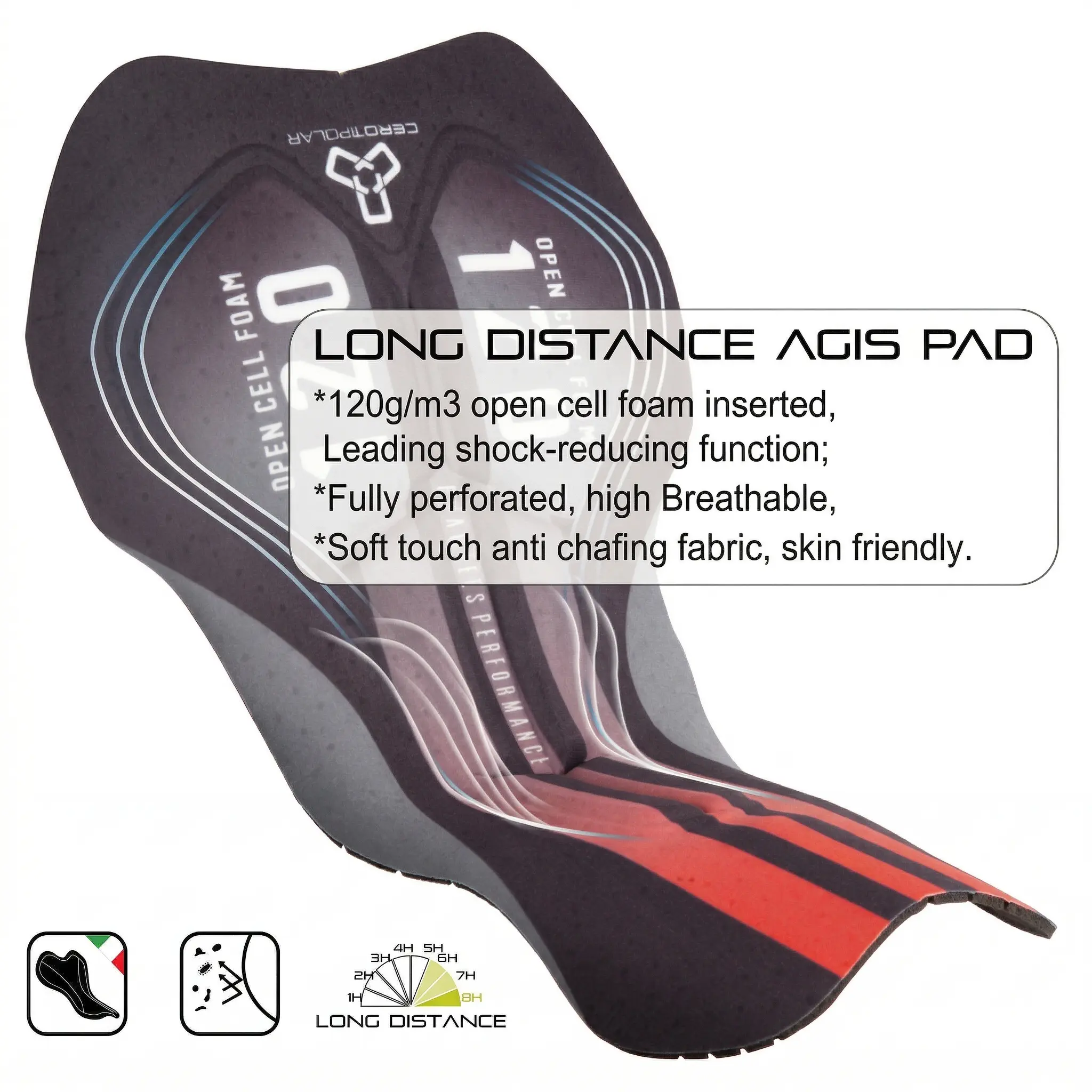 * 4D Agis Comfort Pad:120g/m² Agis Shield open-cell foam with perforated design, targeted shock reduction for sit bones, keeps dry and pain-free during 8+ hour rides.