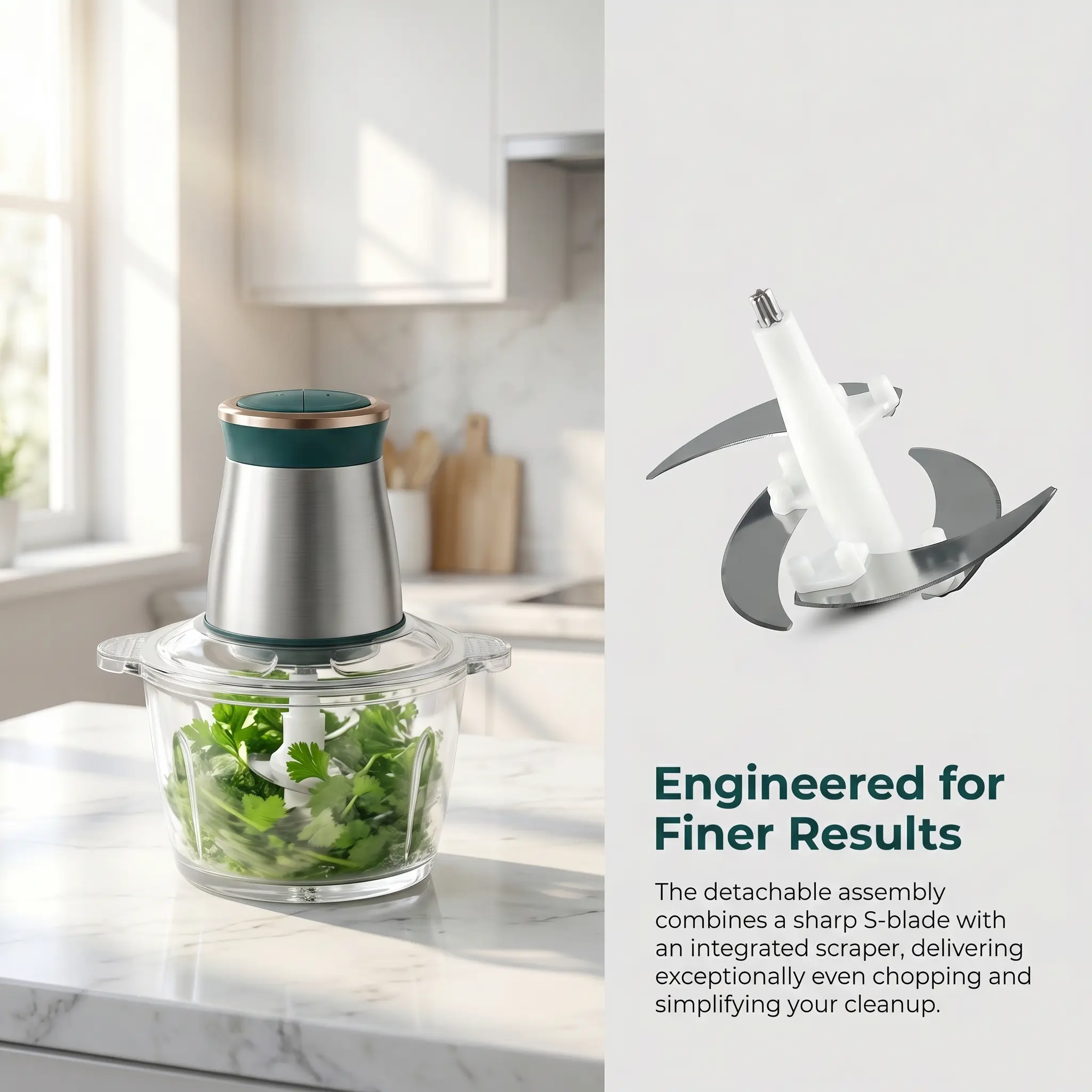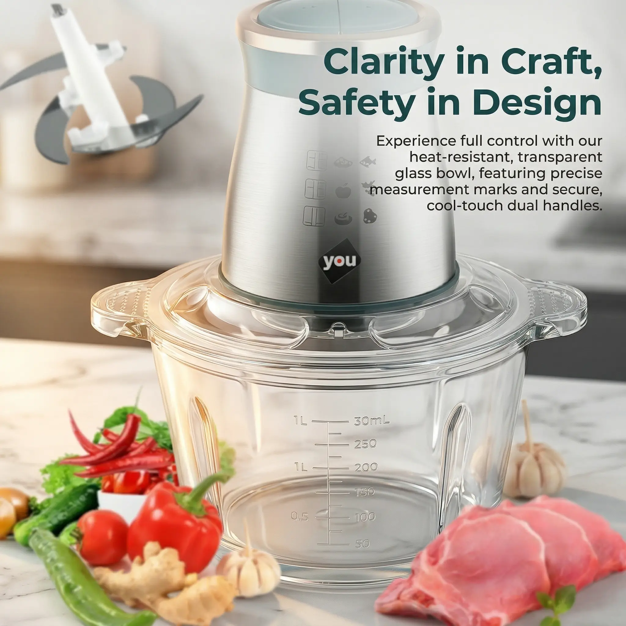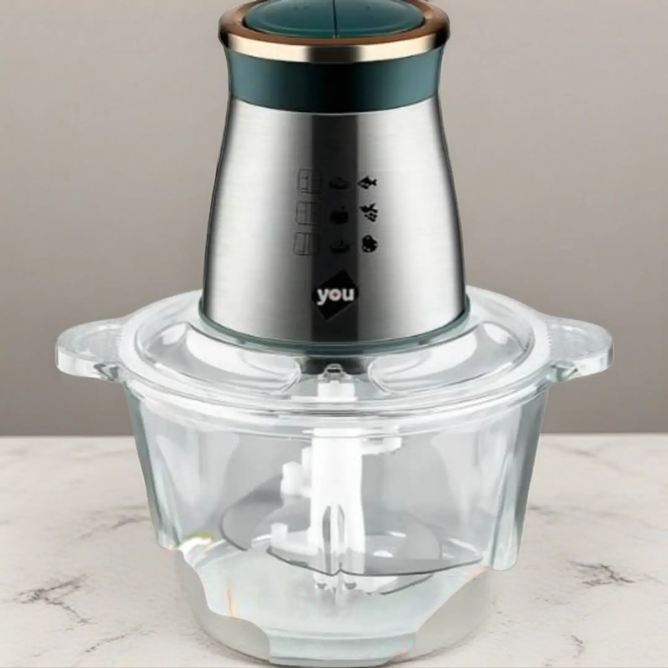 Powerful motor tackles meat, veggies, garlic, ginger & more Large glass bowl, see exactly what you're processing, no guessing! 4 ultra-sharp stainless steel blades for any task Sleek stainless steel design that looks stunning on your counter with multiple settings for full control Easy to clean top lifts right off!