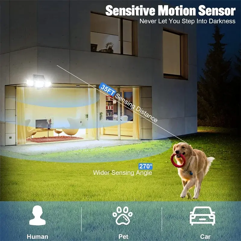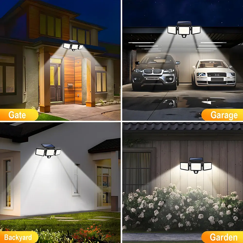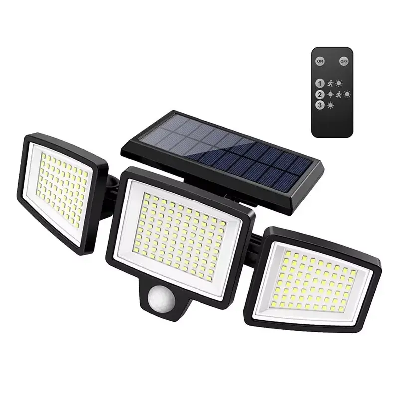 Illuminate your outdoor space with the Solar Outdoor Lights 210 LED. These security lights feature 3 heads and a motion sensor for enhanced safety. The 270° wide angle flood wall lights ensure comprehensive coverage. Perfect for securing your property, these lights come with a remote control for easy management.