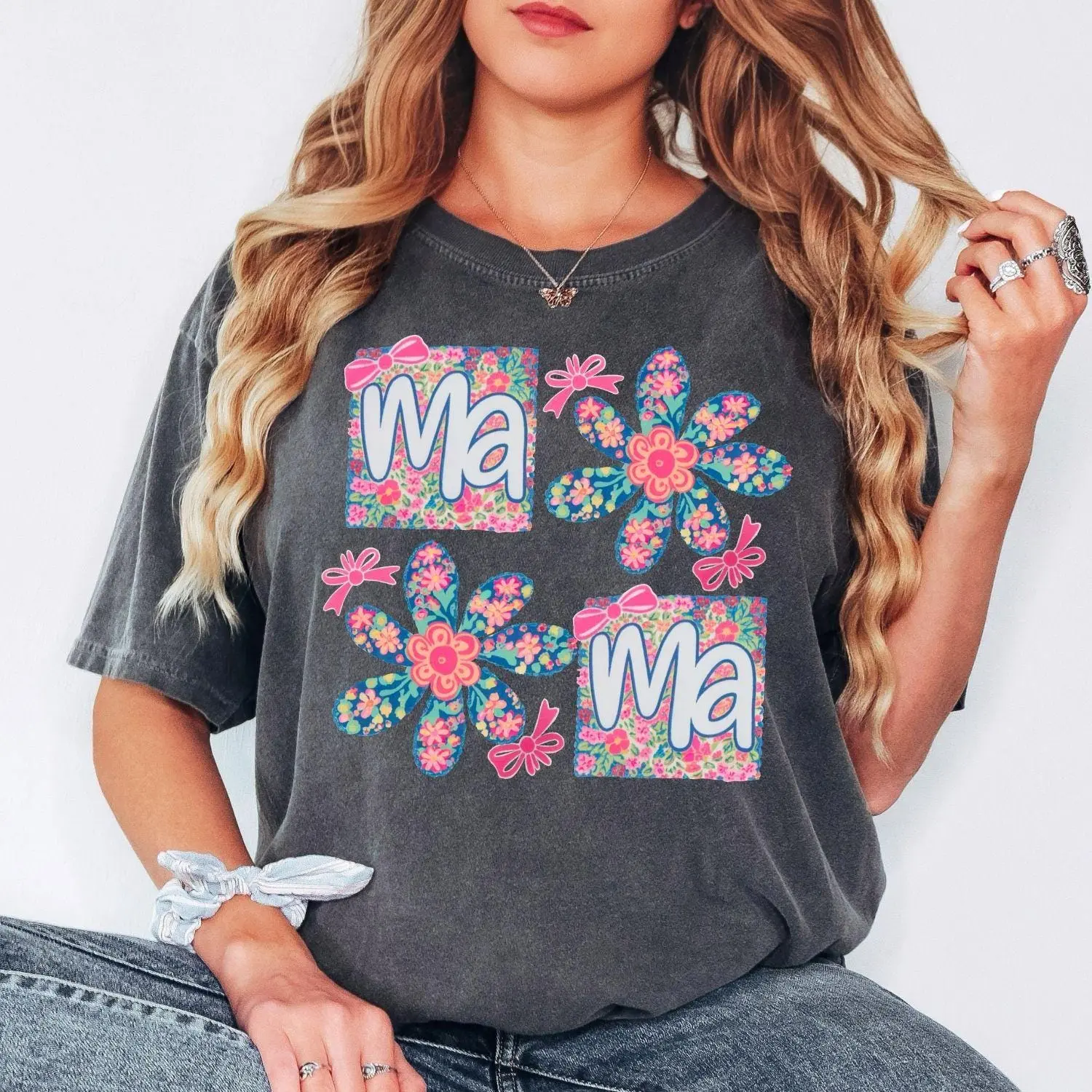 Retro Mama Flower T-Shirt - Vintage Aesthetic Mama Floral Tee, Hand-Painted Style Daisy Graphic Top, Cute Mother's Day Gift, Trendy Boho Mama Top, Soft Mineral Wash Graphic Tee for Women, Casual Spring Summer Outfit