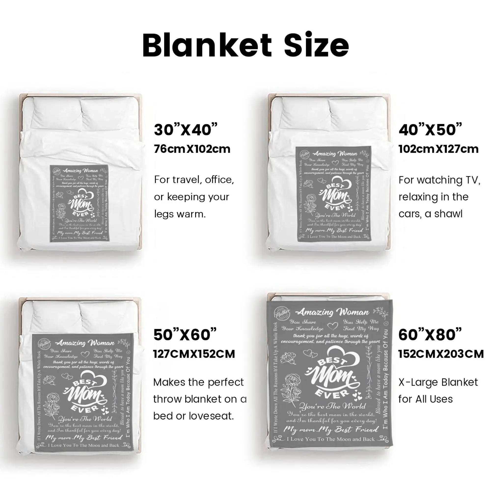 Product Description:Wrap your mom in warmth, love, and appreciation with this beautifully designed “Best Mom Ever” blanket. Featuring heartfelt messages and elegant floral accents, this cozy throw is more than just a blanket—it’s a daily reminder of how much she means to you.