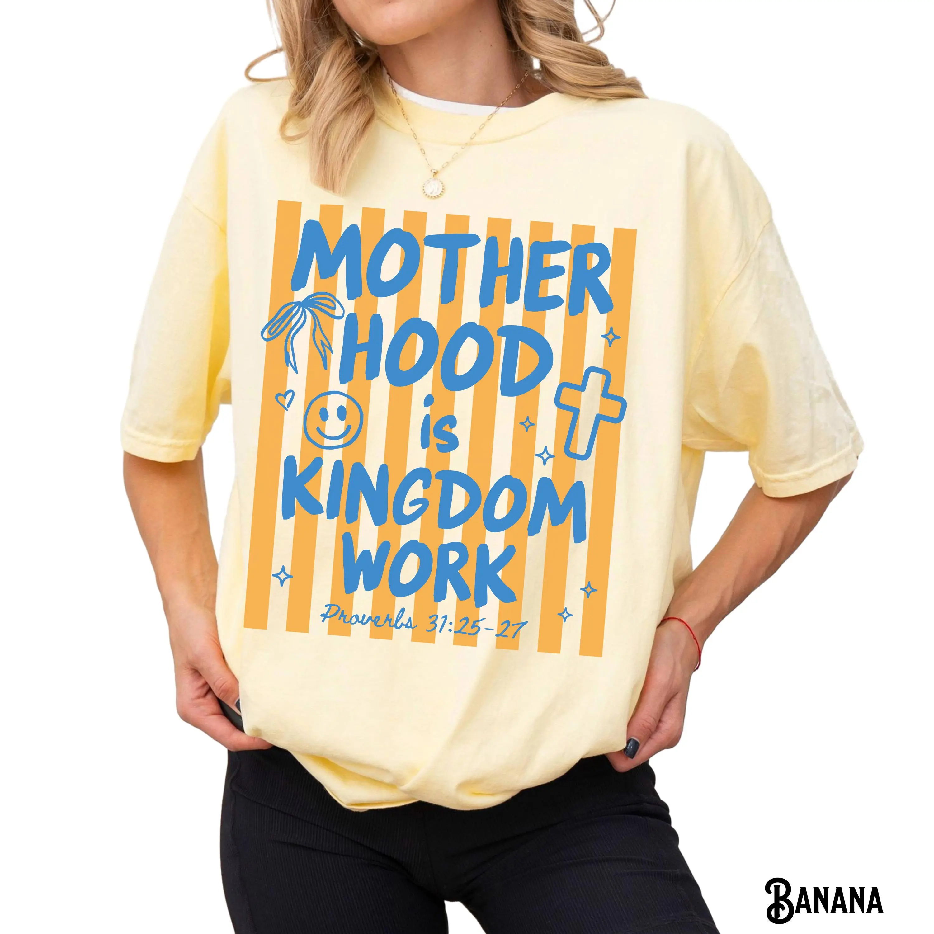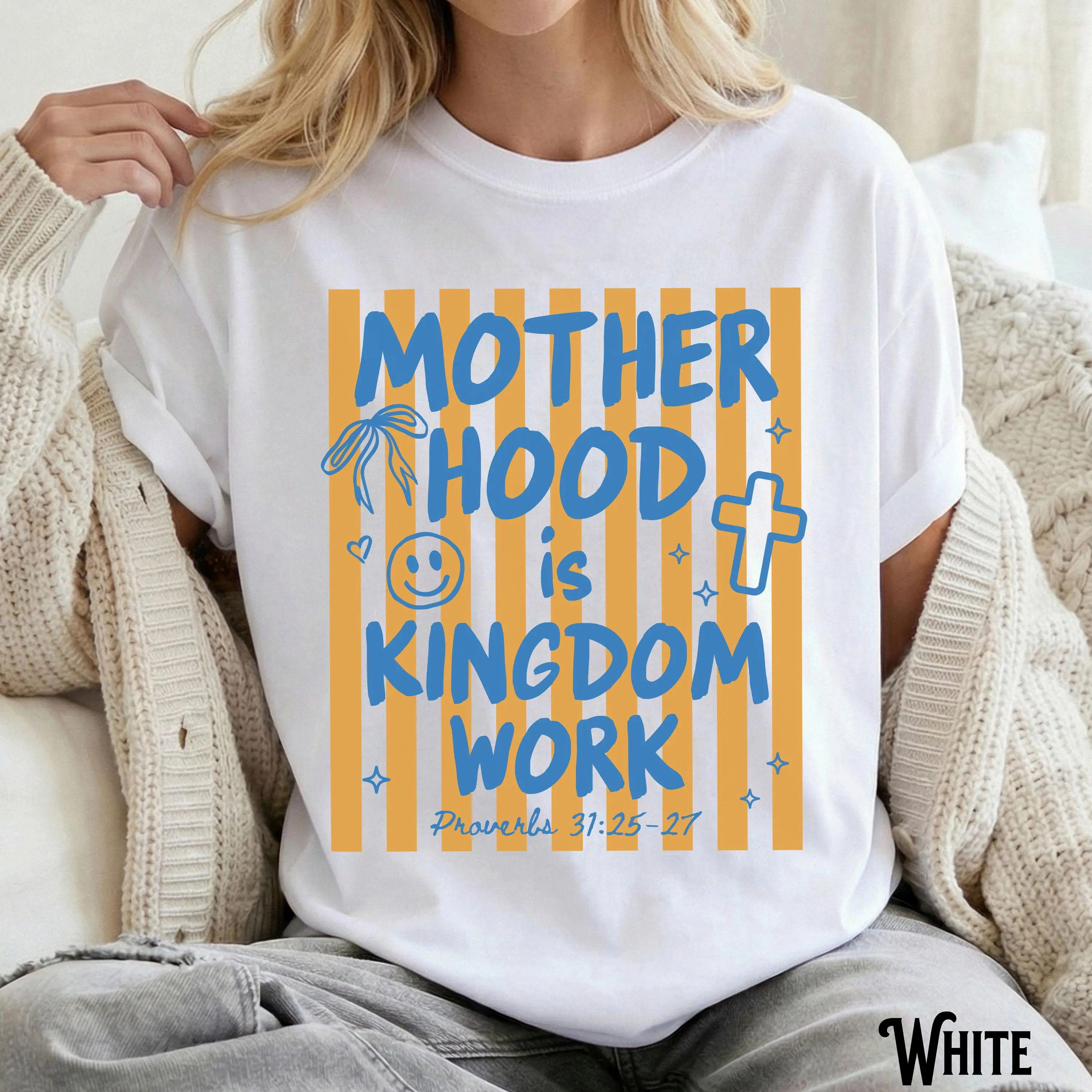 Christian Motherhood T-Shirt - Motherhood is Kingdom Work Bible Verse Tee, Proverbs 31:25-27 Graphic Shirt, Perfect Mother's Day Gift for Christian Mom, Retro Coquette Bow Aesthetic Top, Inspirational Faith Based Women’s Tee, Cute Mom Life Outfit