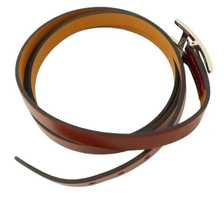 Pre-owned Hermès Hapi 3 bracelet in Rouge H box calf leather, featuring the iconic Ginpaku Teba design. This luxury piece showcases the timeless appeal of Hermès craftsmanship with its rich red hue and supple calfskin construction. In good condition with minor scratches and signs of gentle wear that reflect its pre-loved status. The bracelet fits arm circumferences of 14-16cm, with a motif width of 33mm and vertical height of 12mm. A sophisticated accessory for the discerning collector seeking authentic Hermès heritage at a more accessible price point.
