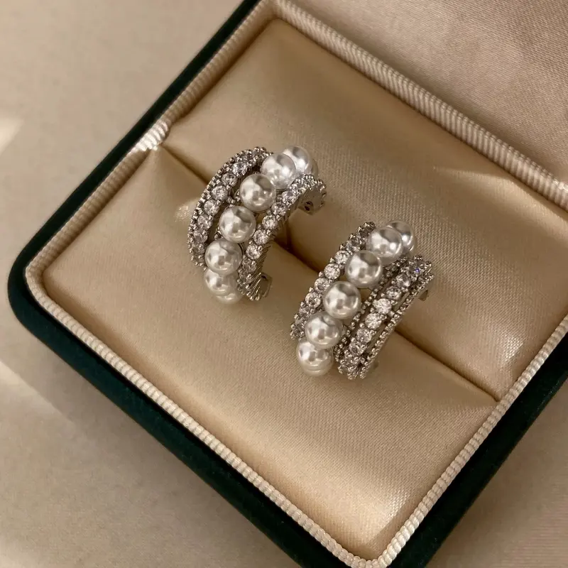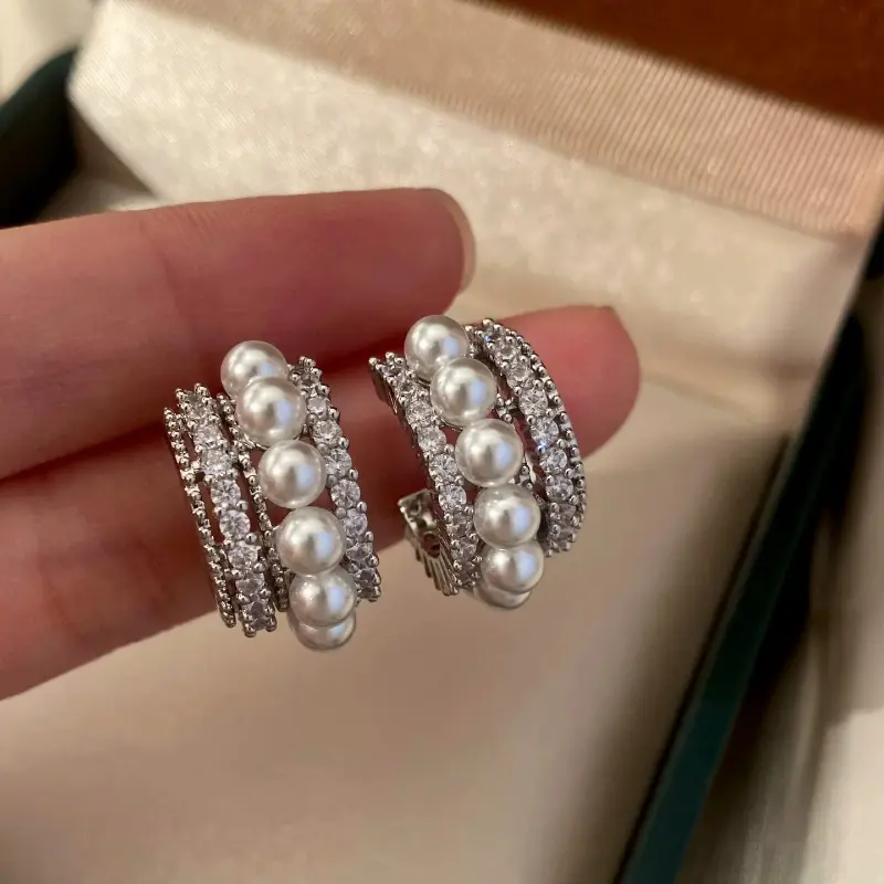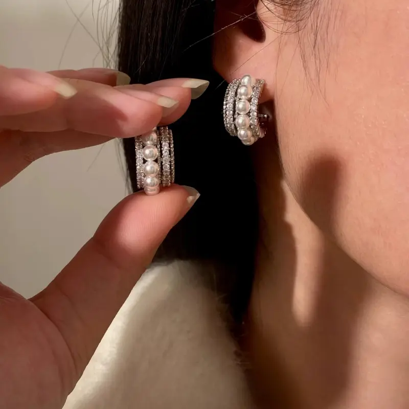 French Style Layered C-Shaped Pearl Zircon Earrings shell pearl