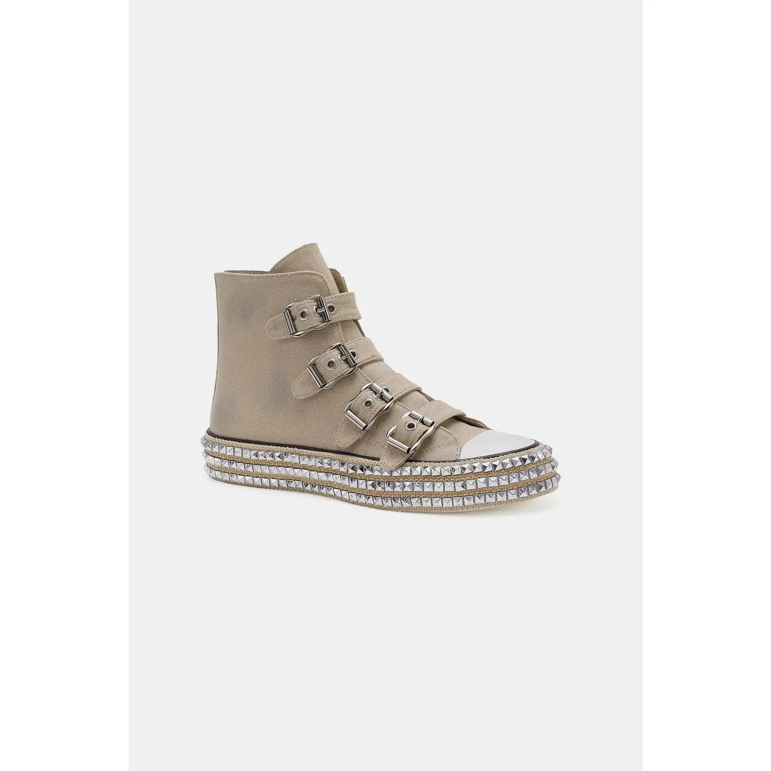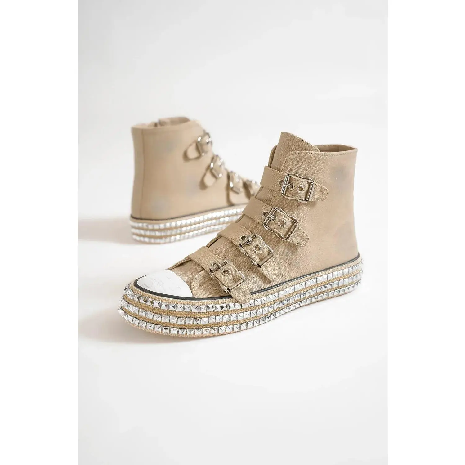 Turn coastal vibes into city-ready stride with our Multi Buckle Straps Studded Platform Sneakers. A 1.5-inch platform adds height without sacrificing comfort, while secure multi-buckle straps with studded accents give a subtle punk edge to beach-to-street looks. The textured khaki canvas pairs with denim, dresses, or cropped pants for endless outfit options. Designed for all-day wear, true-to-size fit, and easy adjustability—perfect for boardwalk strolls, sunlit sidewalks, and laid-back mornings. Ships from the USA. Are you ready to elevate your everyday style?