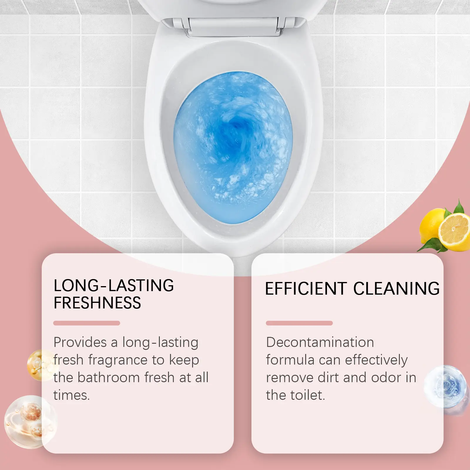 Our toilet cleaning block contains lemon extract, disodium EDTA, and sodium bicarbonate. It provides a long-lasting fresh fragrance, keeping the bathroom consistently clean. With its stain-removing formula, it effectively eliminates dirt and odors from the toilet. The usage method is simple: 1. Place one block in the toilet tank, where it will gradually dissolve over time. 2. After each use, press the flush button to clean the toilet. The cleaning effect lasts up to three months, maintaining long-term cleanliness and improving the bathroom environment.