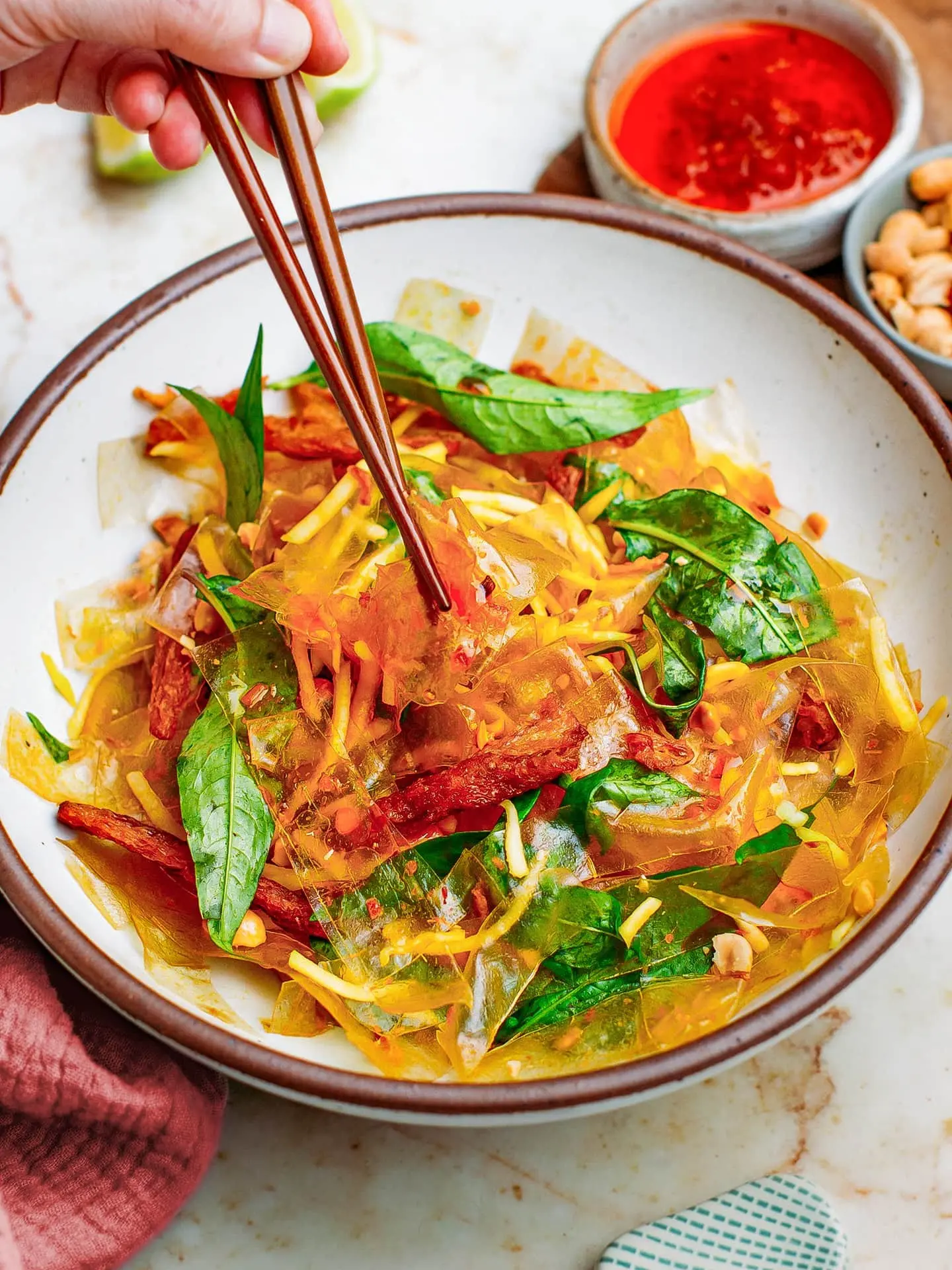 ·Let it sit 5–10 minutesRice paper softens from the sauce (not water)That chewy + slightly sticky texture = correct