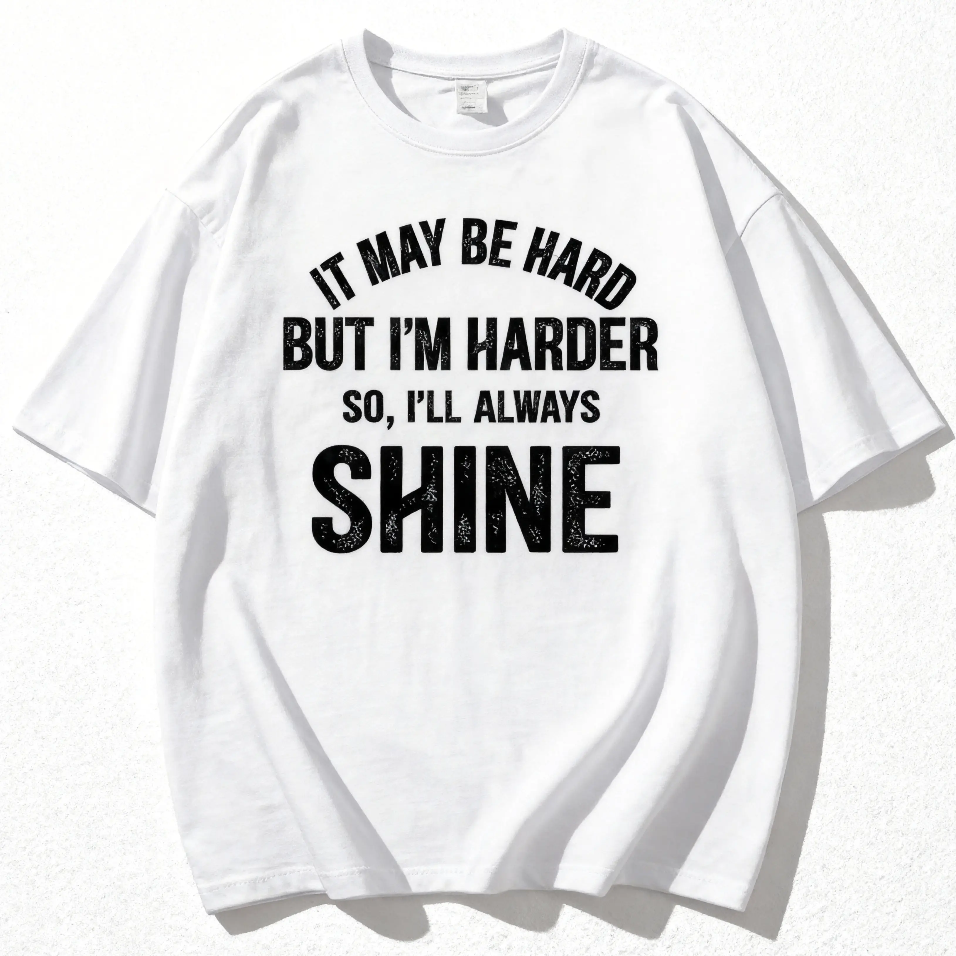 The design delivers a four-line punch: IT MAY BE HARD / BUT I‘M HARDER / SO I’LL ALWAYS / SHINE. No fluff. No sugarcoating. Just raw unapologetic truth. The word SHINE stands boldest because that‘s your final move. Every time you wear it you declare that you outlast every struggle.