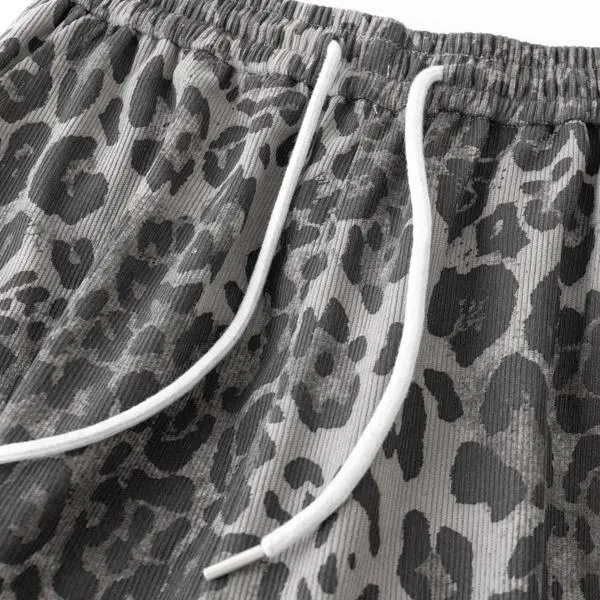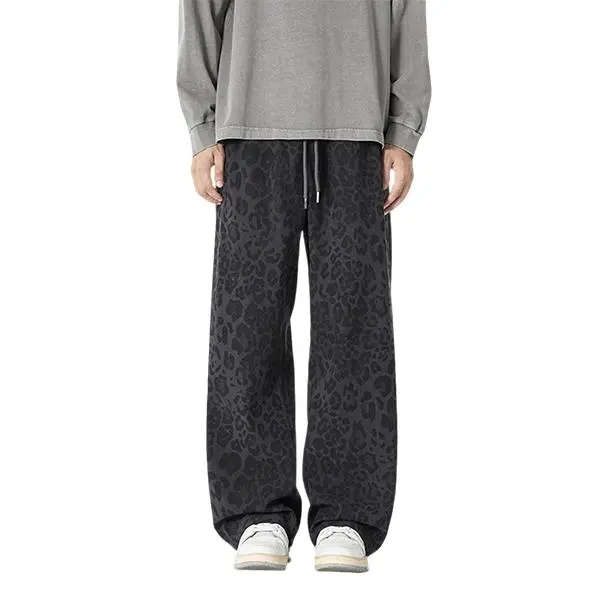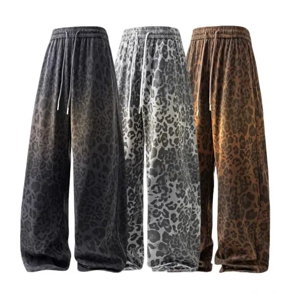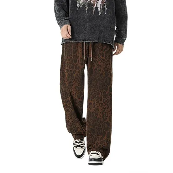 Men's Soft Brown Leopard Print Wide Leg Pants, Casual Drawstring Baggy Trousers, Perfect for Street, Skate, Daily & Streetwear