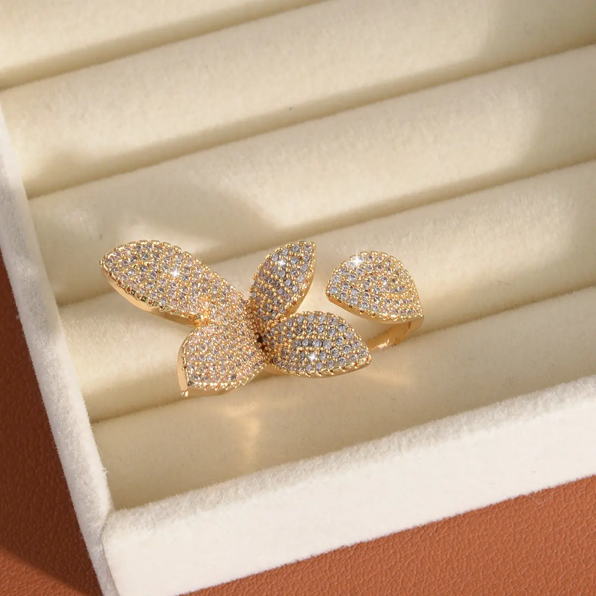 Crafted with meticulous attention to detail, the ring features a stunning, sculptural butterfly silhouette—each of the five delicate wings is densely covered in a continuous layer of faceted, light-catching details that catch and reflect light with every movement, creating a luminous, eye-catching glow that radiates from every angle. The smooth, polished base delivers a substantial, premium feel on the finger, while the adjustable open cuff design ensures a comfortable, customized fit that glides on effortlessly and suits most finger sizes.