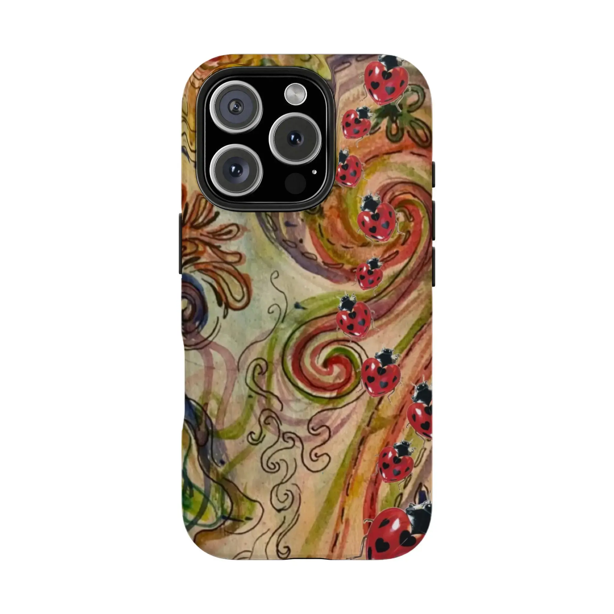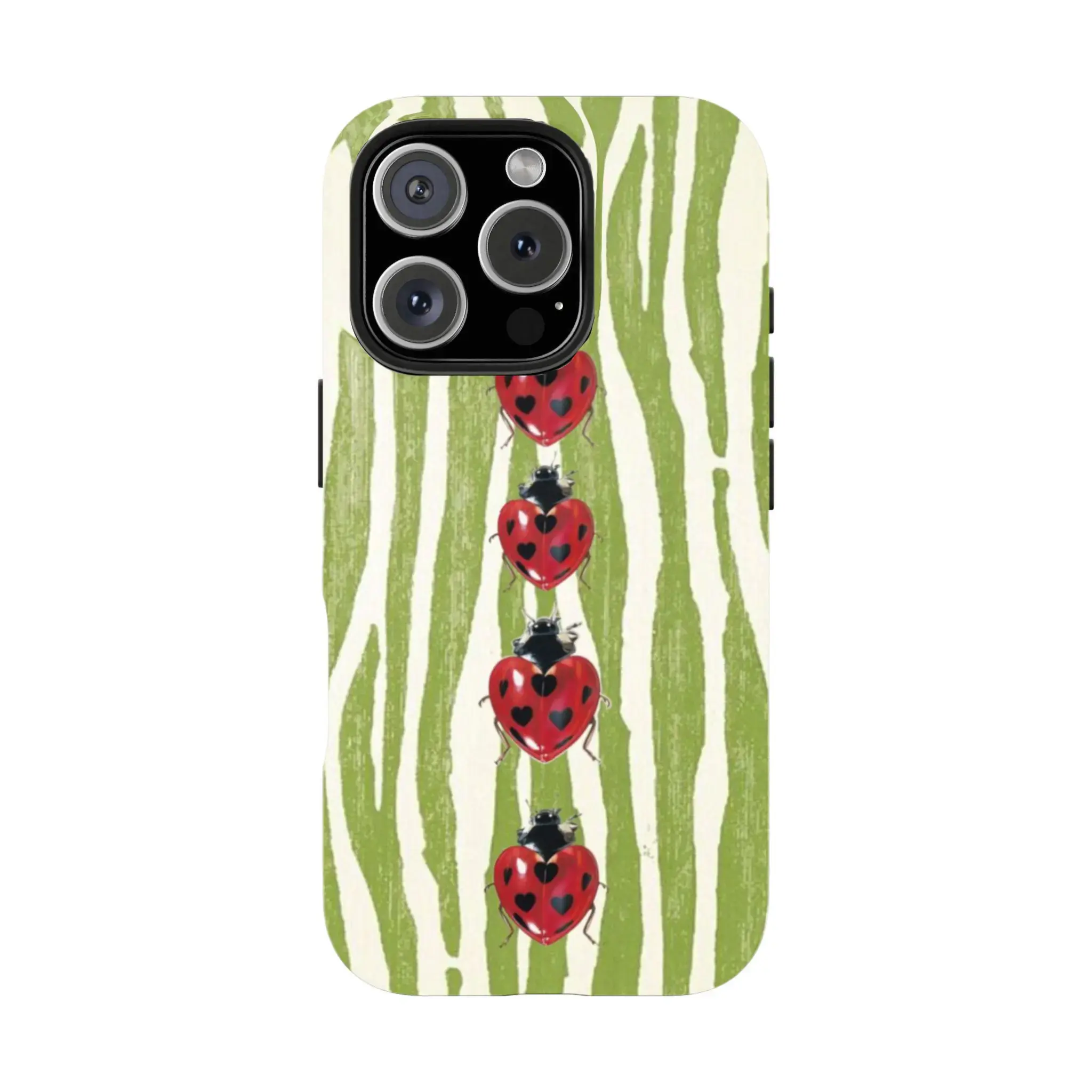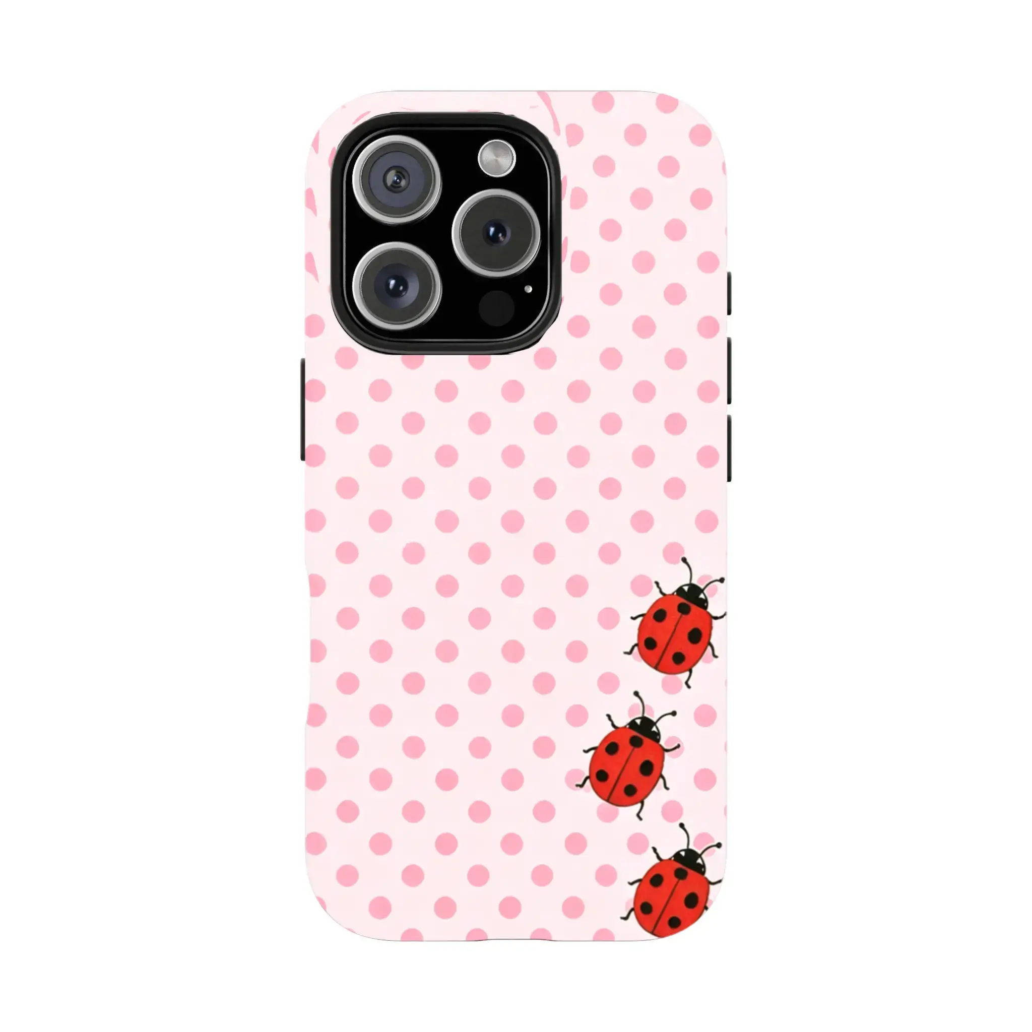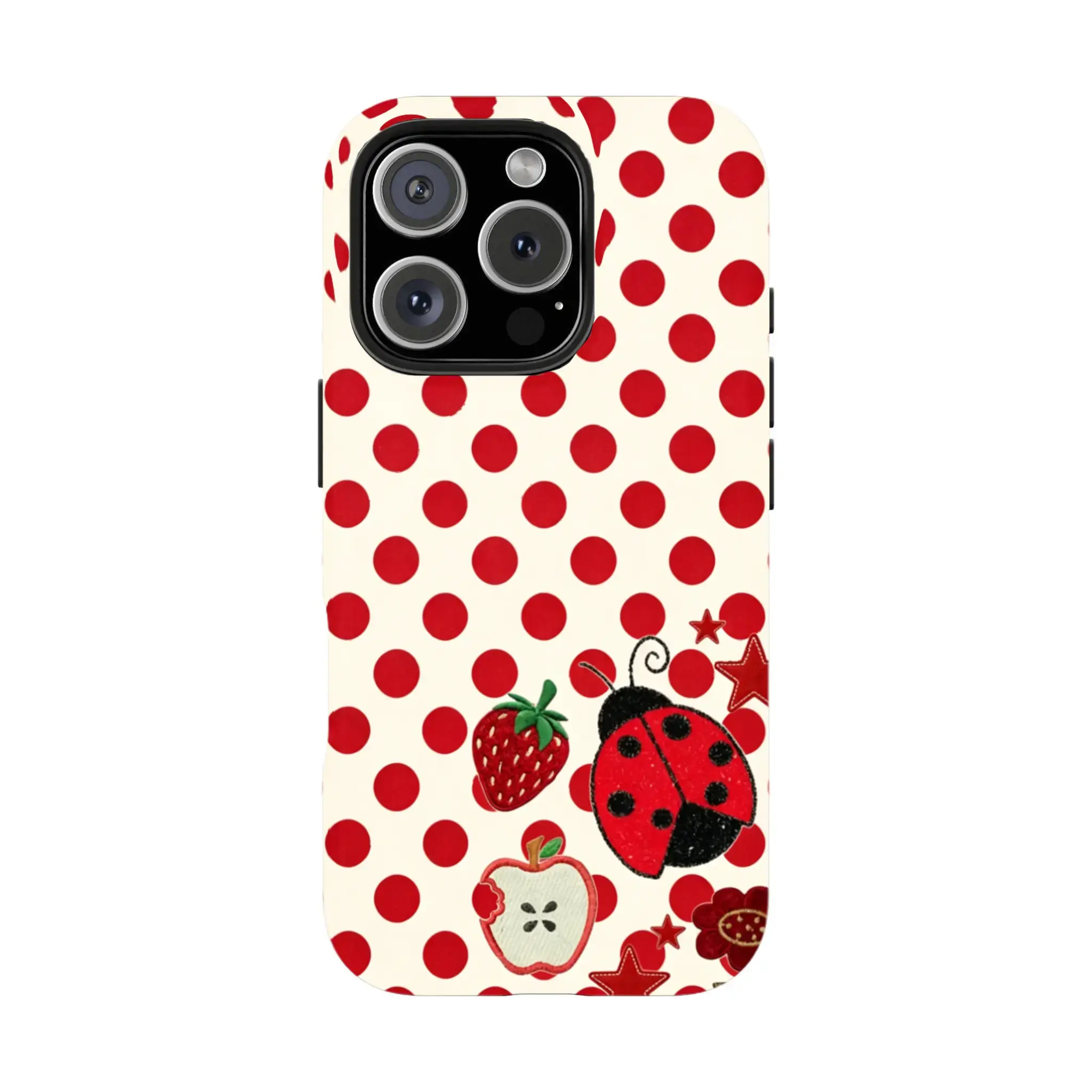 This adorable ladybug phone case fits iPhone 17, 16, 15, 14, 13, 12, and 11. It features a cute cottagecore aesthetic with a ladybird patchwork design. The polka dot floral and kawaii vintage garden art make it a charming accessory. Ideal for anyone who loves unique, playful designs.