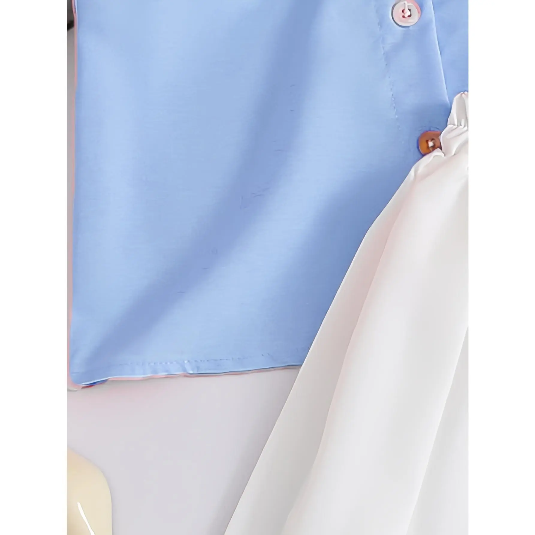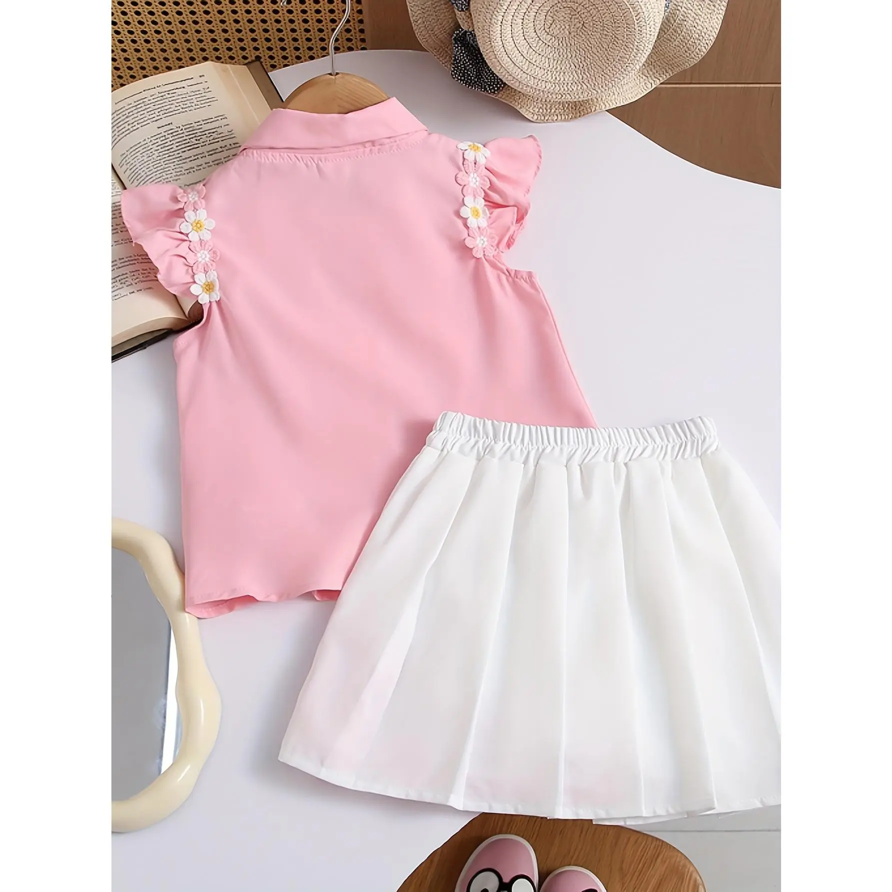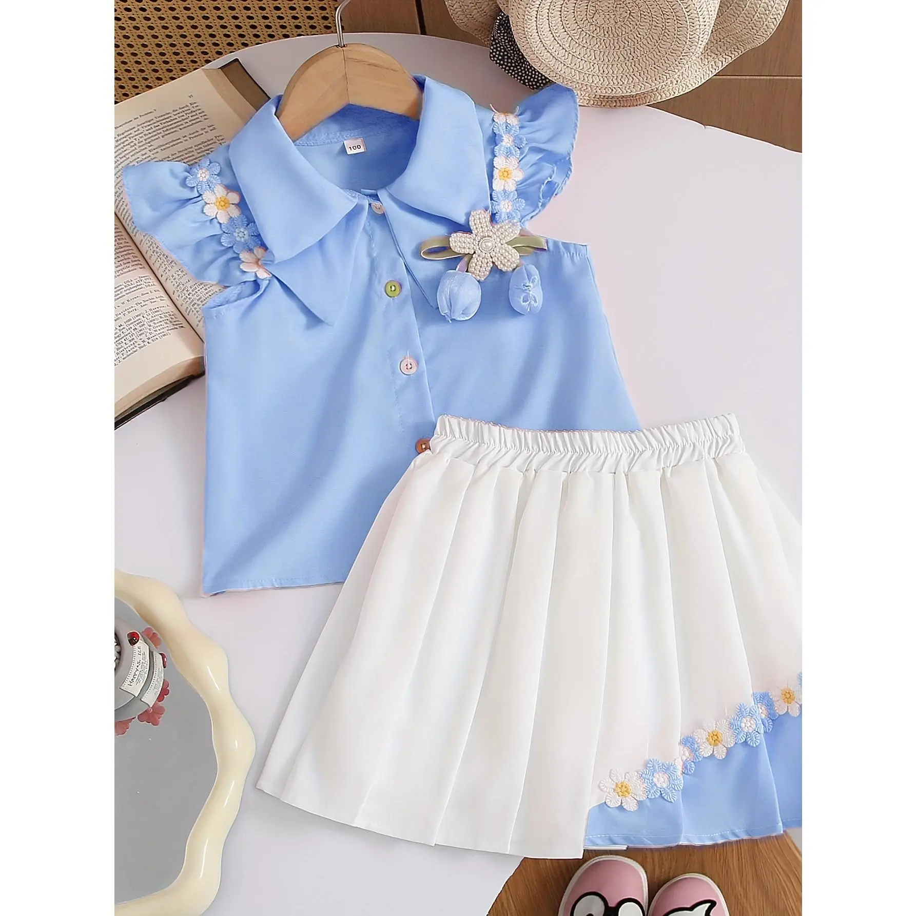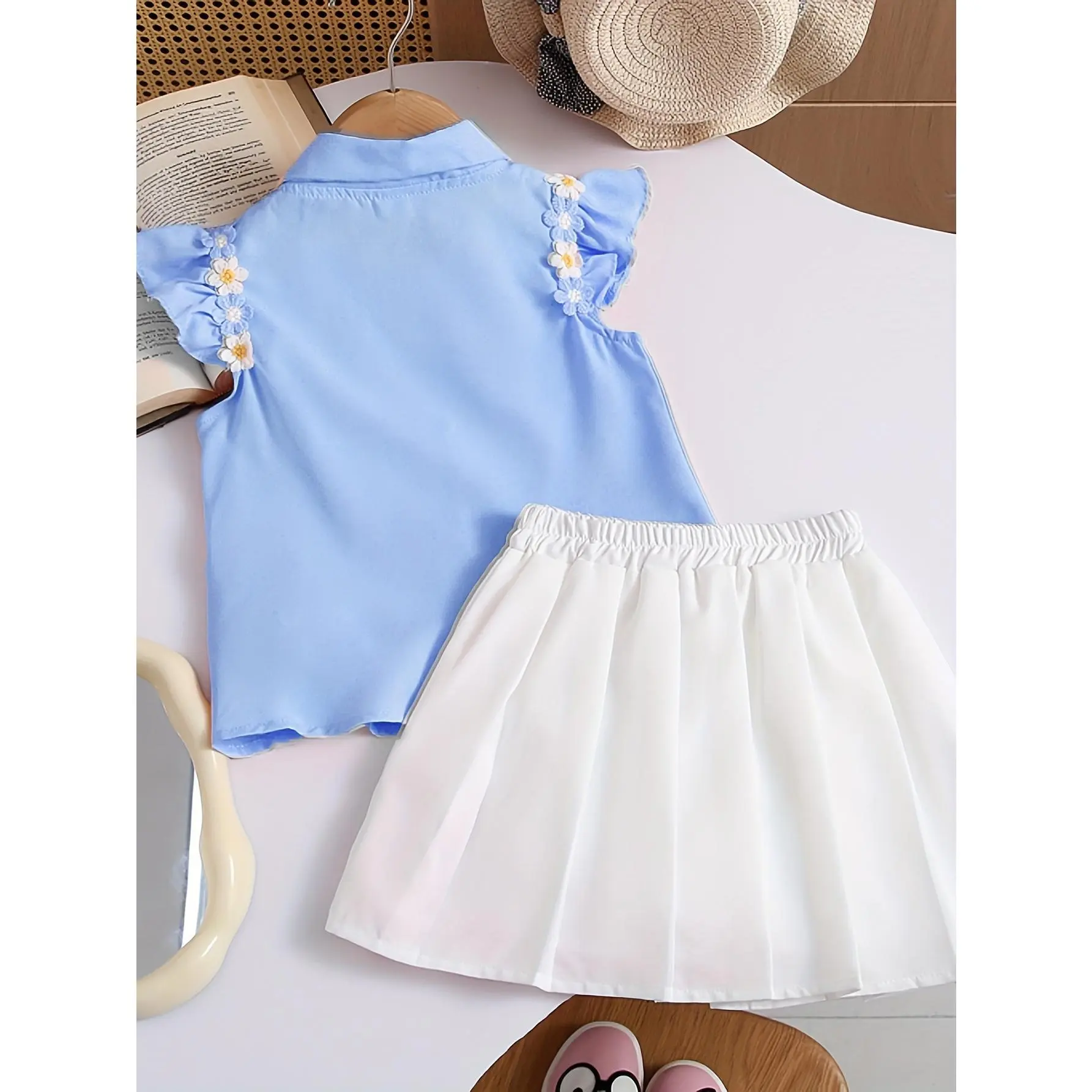 New(New)New Girls' Set, Stylish Children's Summer Outfit, Little Girl's Short-Sleeve Shirt and Pleated Skirt 2pcs Set