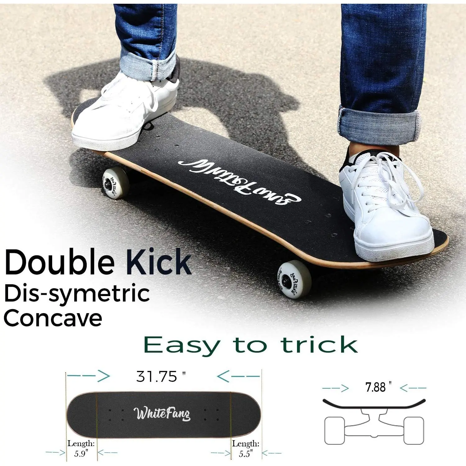 WhiteFang Skateboards for Beginners, Complete Skateboard 31 x 7.88, 7 Layer Canadian Maple Double Kick Concave Standard and Tricks Skateboards for Kids and Beginners