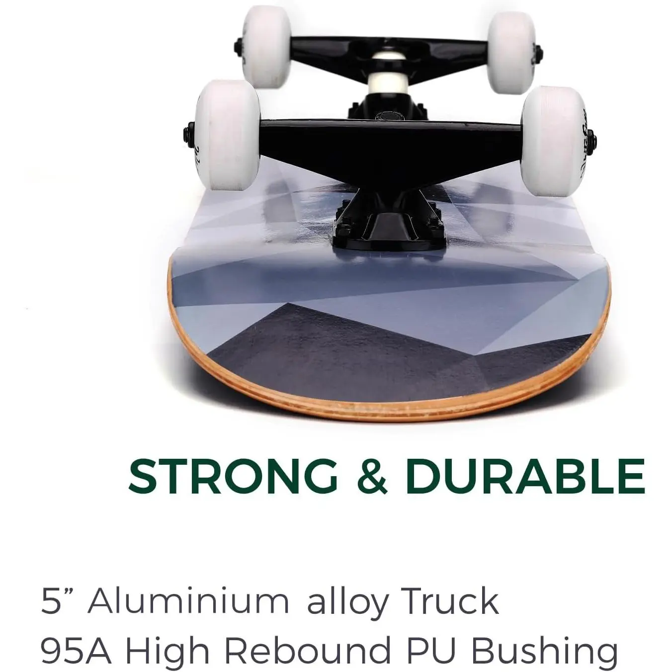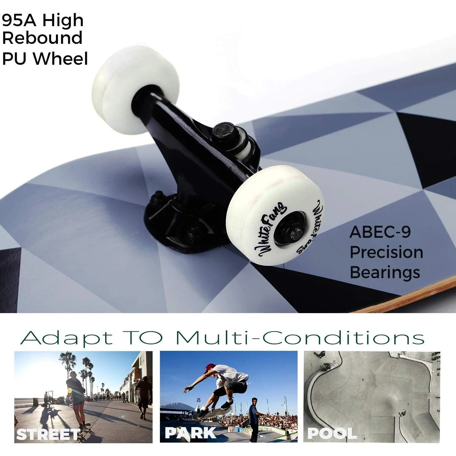 Solid&Durable : 7 layers Canadian maple deck,31.75"*7.88", offers perfect balance between toughness and weight.Maximum load weight up to 220 pounds, equipped with 5 inch aluminium alloy trucks.Reliable for beginner and skilled.Smooth&Speedy : Super smooth (52mm,95A)High rebound PU wheels with ABEC-9 precision bearings and 95A High rebound PU bushing;Our wheel can give you quick response from the ground,suitable for commuting, skate parks, ramps, pools and other smooth surfaces or even rough ground.Master New Tricks :️Design for beginners and skilled, double kick dissymmetric concave combines with customized emery sand paper give your feet enough locked feeling ,help you learn new tricks quickly. Graphic Design: Minimalist Black&White graphic design , printed with thermal transfer printing process allows greater print durability. The pattern lasts much longer. No Assembly Required: Come with completed 31.75"* 7.88" profession skateboard which helps save your time and hassle of assembling. Ready to play out of the box!