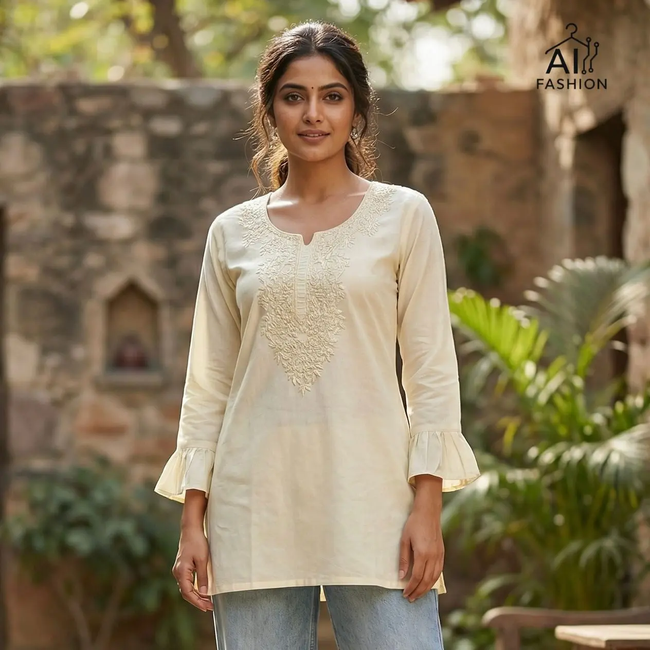 Stylish Short Kurti with Fancy Sleeves & Chikan Embroidery
