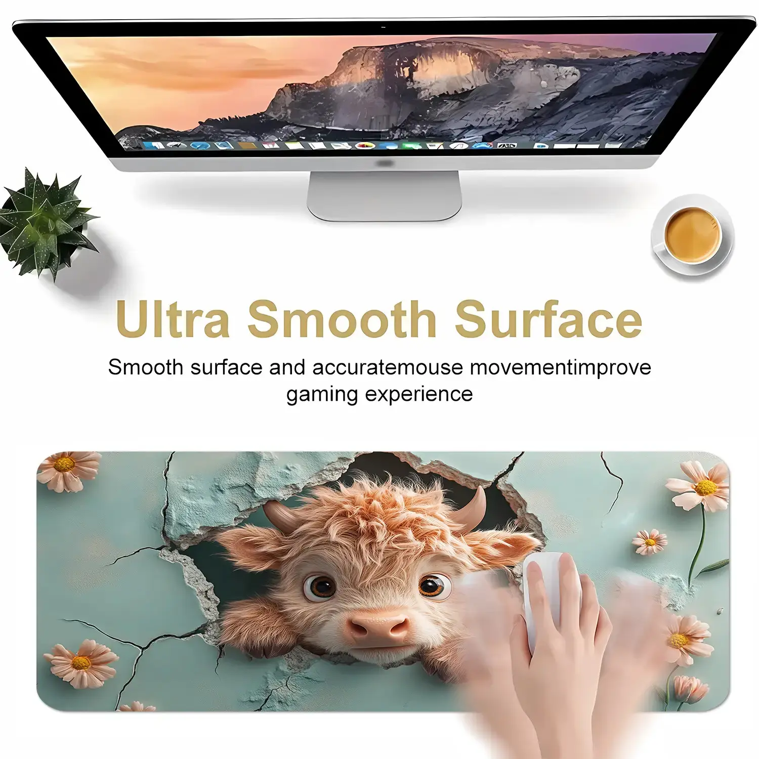 1pc Cute Highland Cow Scottish Cow Desk Mat | Non-Slip Mouse Pad & Keyboard Cover, Turquoise Cracked Ice-like Texture with Pink Flowers, Soft Blue Computer Accessory for Office, Room, Reusable Desk, 2D Flat