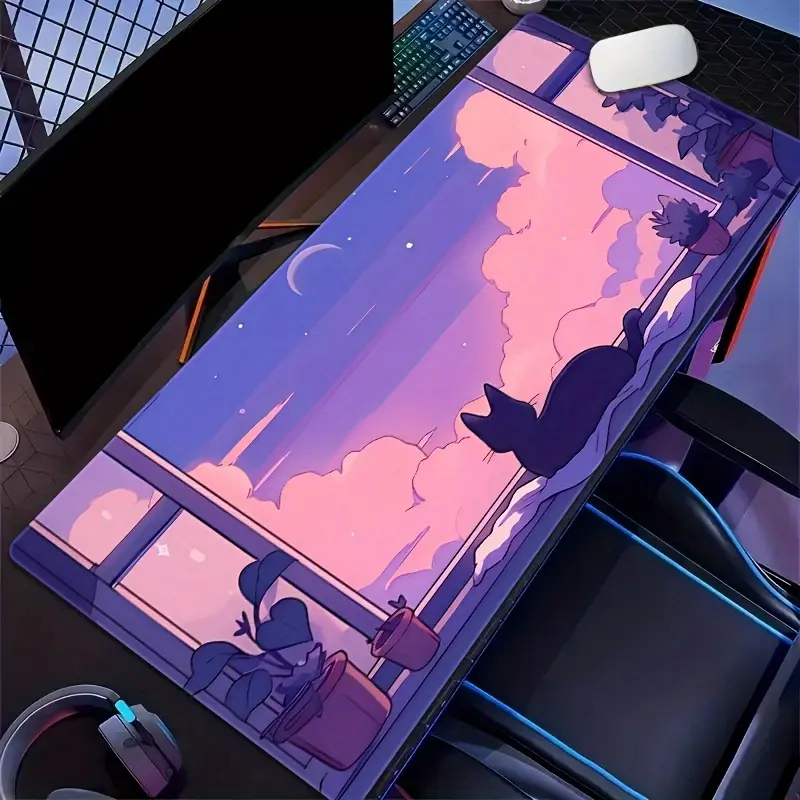 Purple Sky Window Cat, 1pc Extra Large Thick Non-Slip Gaming Mouse Pad, Suitable for PC, Office, and Home Use, Multiple Sizes Available, Enhanced Comfort, High-Density Rubber Base for Stability, Smooth Surface for Precise Tracking, Anime Scenery