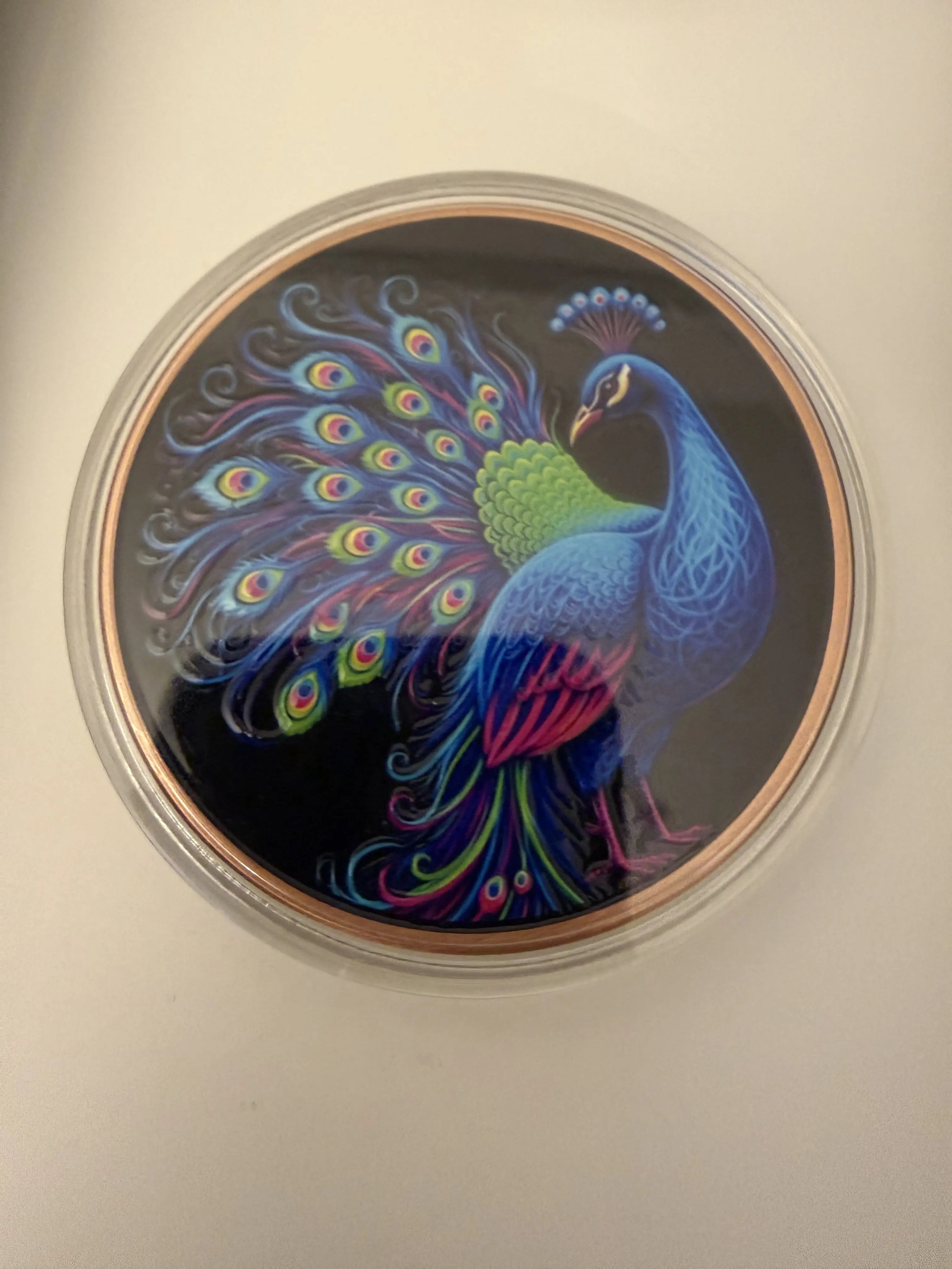 Majestic Peacock Colorized Copper Round toy, The colorized obverse showcases a majestic peacock in brilliant blues, greens, and pinks.