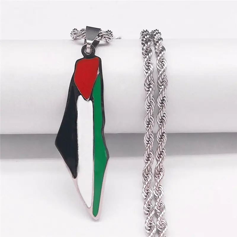 This Palestine map flag pendant necklace is crafted from durable stainless steel with vibrant enamel detailing, showcasing the iconic colors of the Palestinian flag. The twisted rope chain offers a classic, stylish look, while the map-shaped pendant serves as a meaningful statement piece. Waterproof, anti-tarnish, and skin-friendly, it’s perfect for daily wear, events, or gifting to show solidarity and pride. Suitable for both men and women, this necklace combines style and sentiment seamlessly.