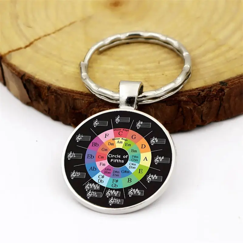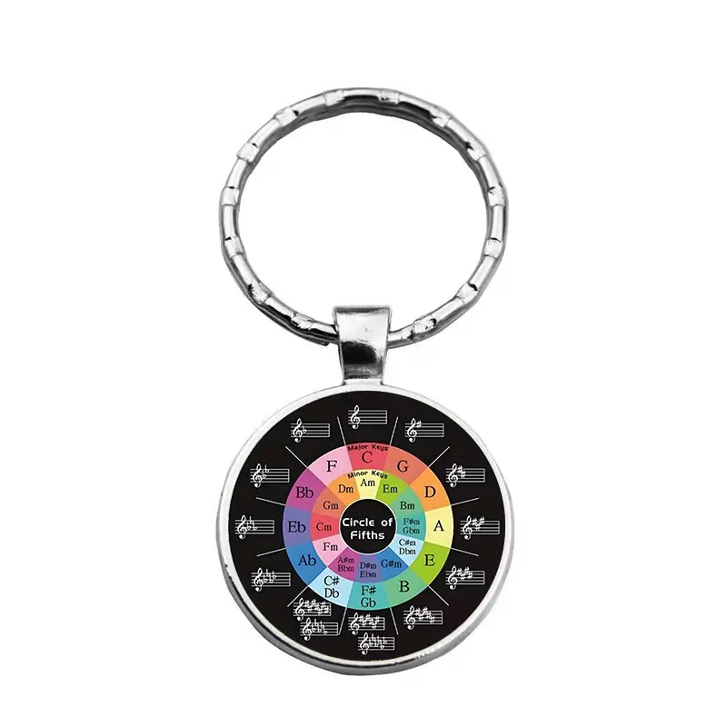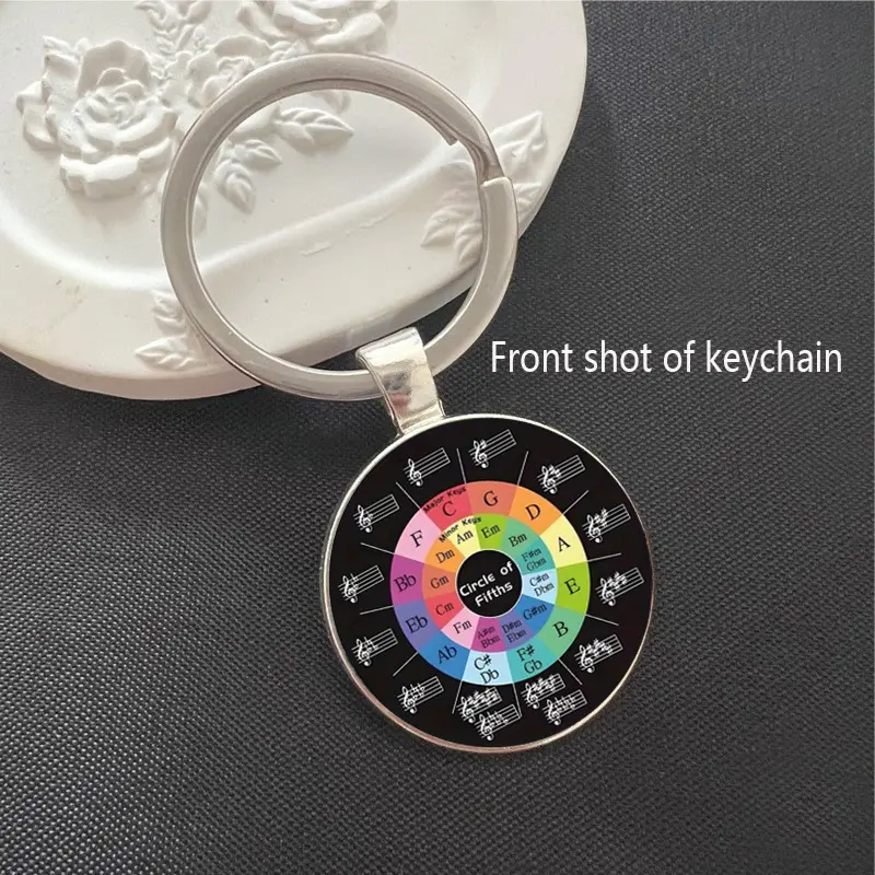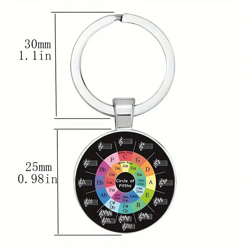 A must-have for every musician! This circle of fifths keychain features a complete music theory chart with major/minor keys, note names, and music symbols, printed on a scratch-resistant glass cabochon. Set in a durable silver alloy frame with a sturdy key ring, it's a practical and stylish accessory for music students, teachers, and music lovers. Perfect for daily use, music classes, and gifting.