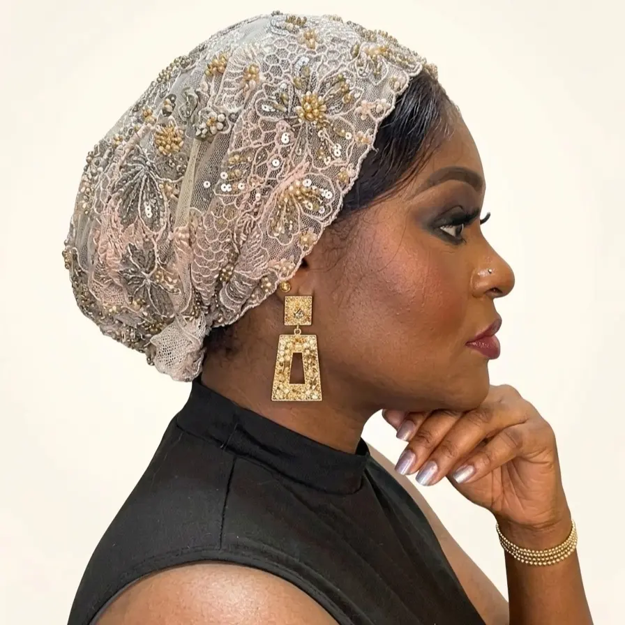 This nude geometric print lace beaded headwrap/turban brings effortless beauty to your everyday style. It is lightweight, breathable, and also easy to style.