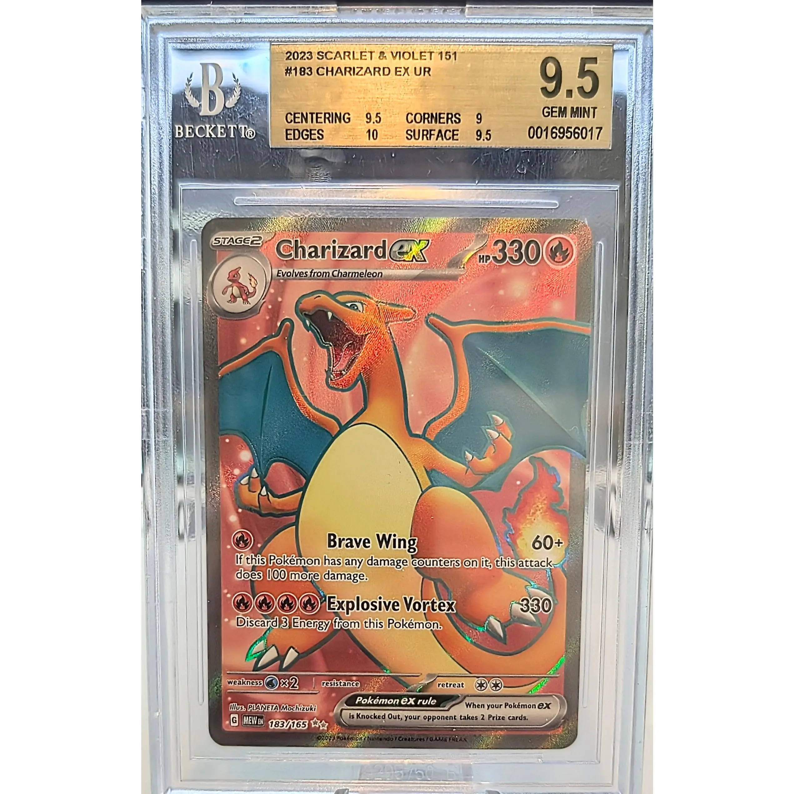 Add this exceptional Charizard EX Ultra Rare from the highly collectible Scarlet & Violet 151 set to your premium collection. This iconic card (#183/165) has been professionally graded by Beckett Grading Services (BGS) and achieved an outstanding 9.5 Gem Mint grade—one of the highest grades possible, ensuring museum-quality condition and authenticity.