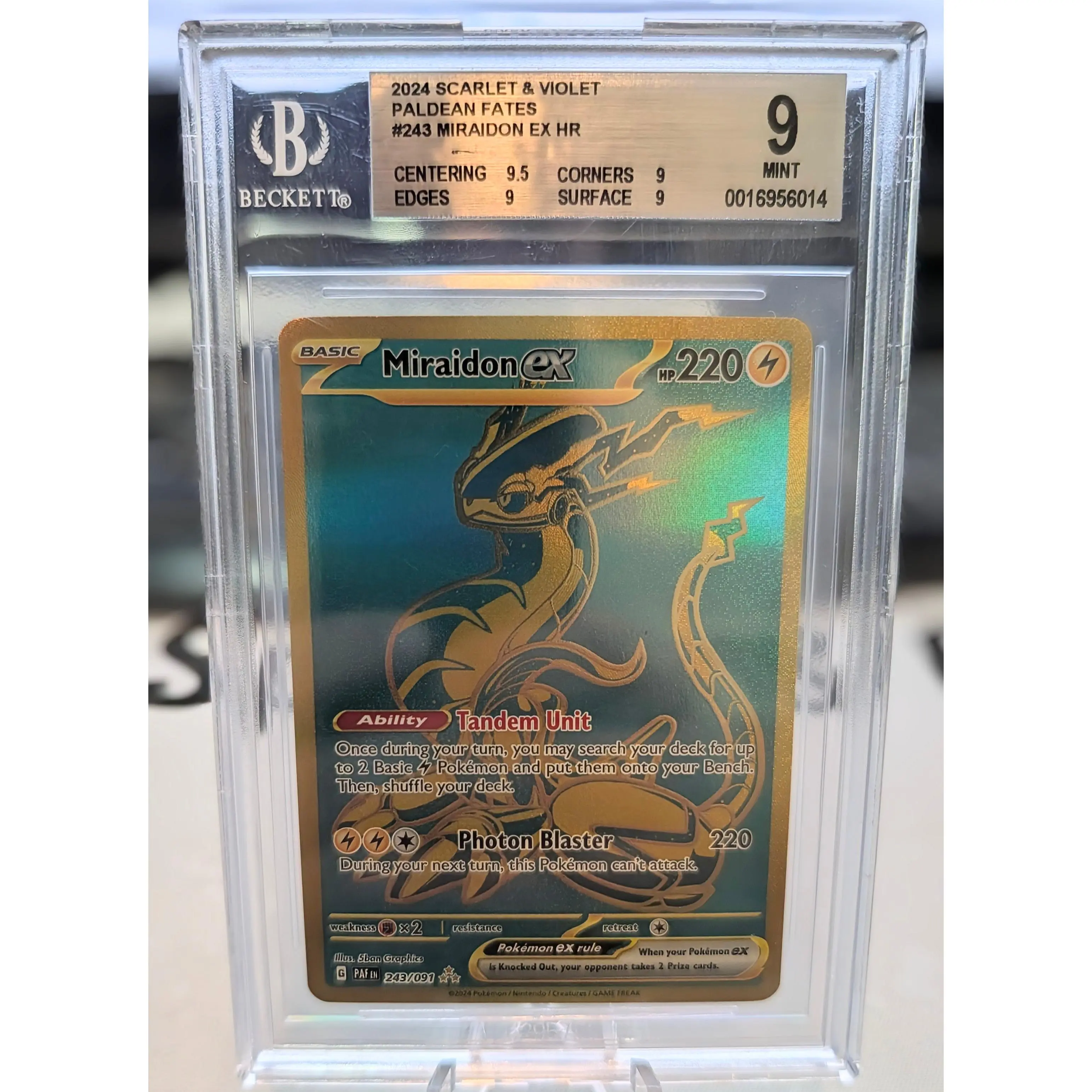 Own a piece of premium Pokémon history with this stunning Miraidon ex Hyper Rare from the Paldean Fates set. This highly sought-after card (#243) has been professionally graded by Beckett Grading Services (BGS) and earned a prestigious 9 Mint grade, ensuring exceptional quality and authenticity.
