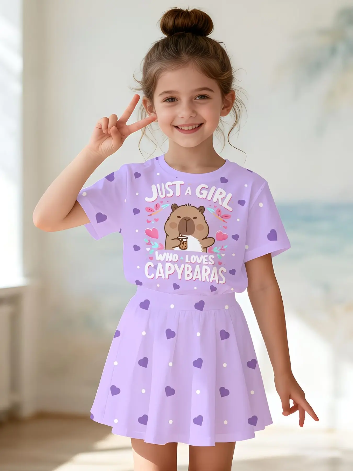 Girls' 3D Heart Print Capybara Pattern Set, Casual Slim-Fit T-Shirt and Skirt, Summer Daily Wear, Round Neck Short Sleeve