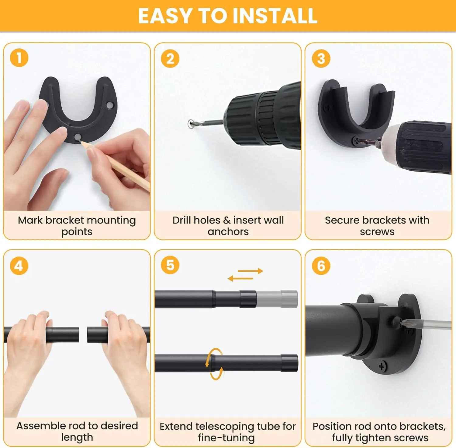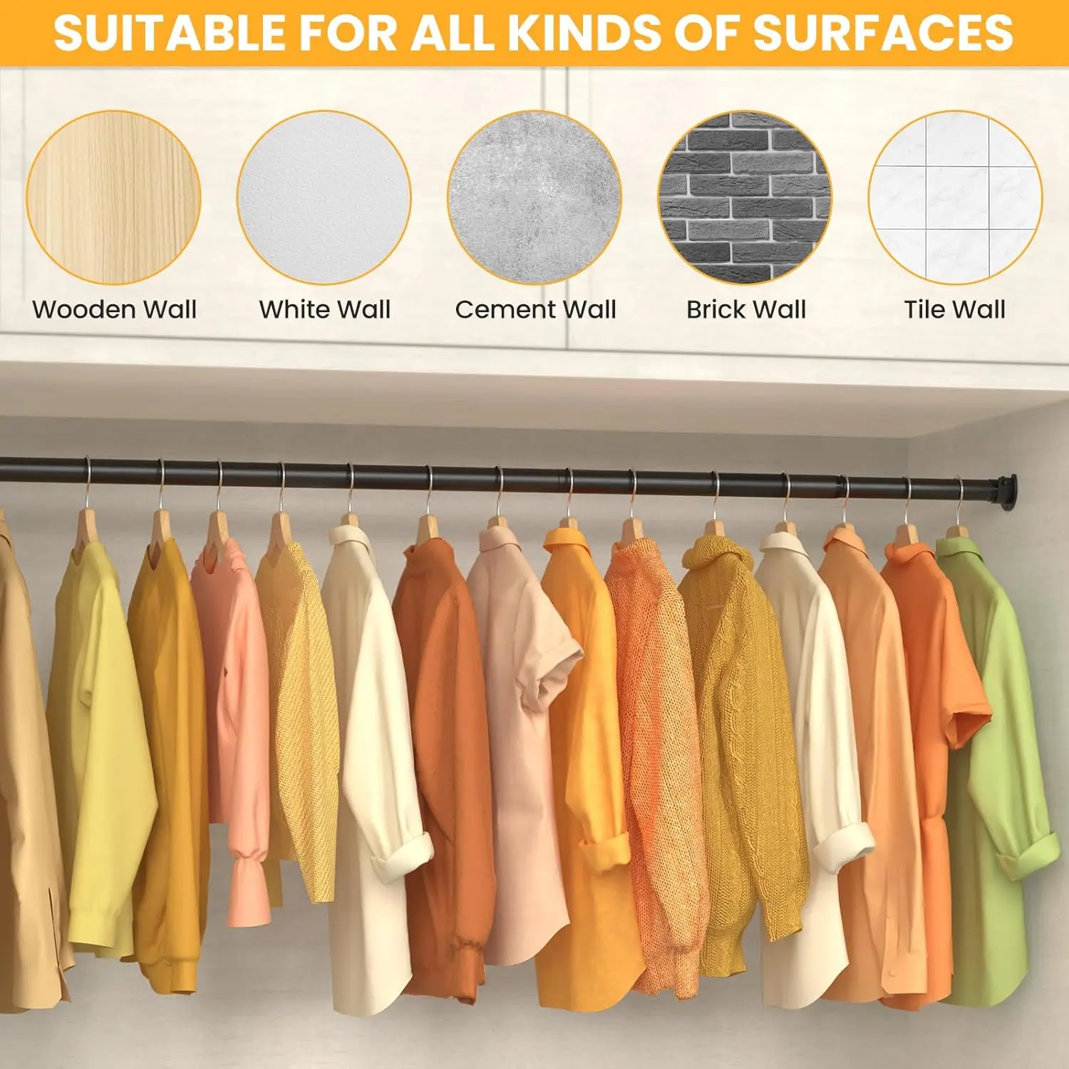 ·Quick & Easy Installation: Adjustable Closet rods for hanging clothes complete hardware kit includes dual-length screws (wood/tile/cement compatible). Simple 3-step setup: Mount brackets → Connect closet poles → Tighten security screws. Suitable for indoor/outdoor use on various surfaces including drywall, wallpaper, and concrete