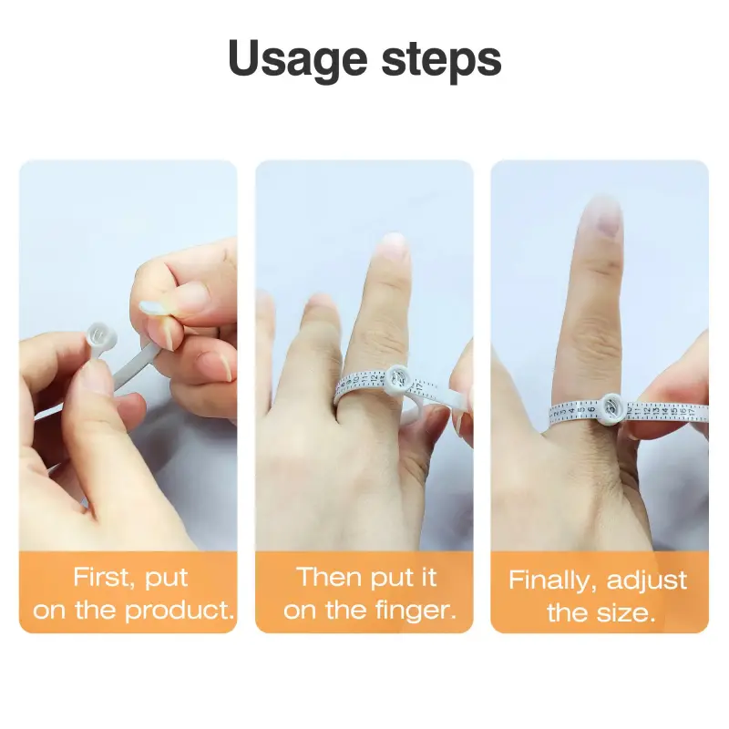 How to Use: This ring works as a belt. Simply push the end through the buckle to form a ring shape. Then slip it onto your finger and adjust for a comfortable fit. Simply read off the size through the magnified glass. Note: Check that it slips over the joints of the finger without much difficulty.