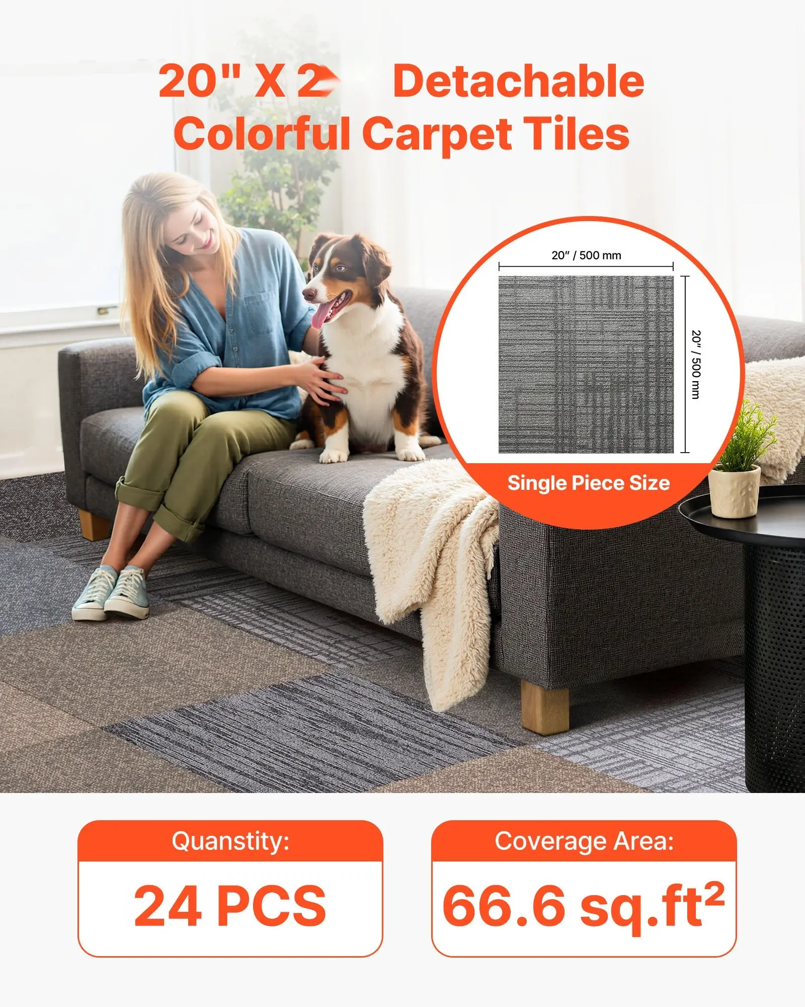 ·Replaceable Carpet Tiles Set: This full set includes 24 pcs multicolor carpet tiles, each measuring 20x20 in / 508x508 mm. When fully assembled, the rug tiles covers a total area of 66.6 ftò. Installation quick and effortless,even one person can do it