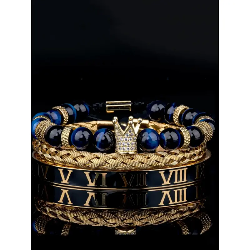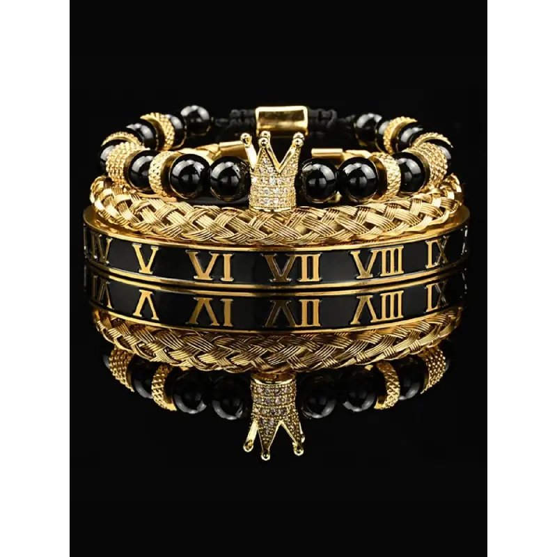 Men's Black Onyx Bracelet Set, Rhinestone Crown Decor Beaded Bracelet, Braided Bracelet, Rhinestone Decorated Bracelet, Bracelet for Men, Jewellery Accessories for Gift, Accessories, Bracelets